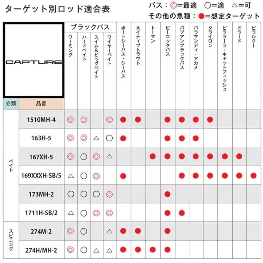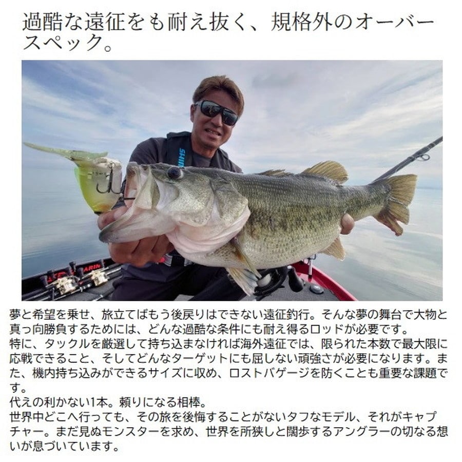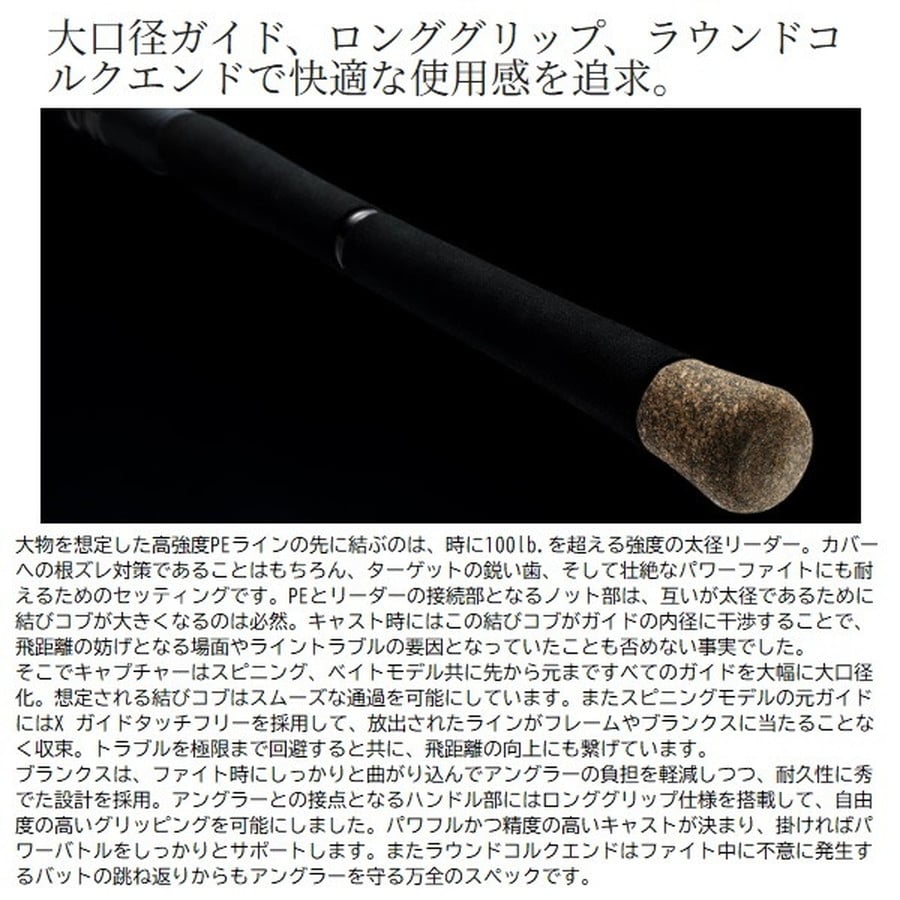 世界の巨大魚に挑む剛のツアーロッド。遠征指向の高まりを受けて誕生した剛のツアーロッド。国内のジャイアントバスやトレバリーをはじめ、海外のバラマンディ、ピーコックバスといった巨大魚と真っ向勝負。飛行機の手荷物で預けられるワン&ハーフと、スーツケースに収まるマルチピースの2仕様展開。■1711H-SB/2・・・One &Half select。国内外での用途を見据えて、携行レングスとパワーのベストバランスを目指したワン&ハーフデザイン。3~5lbクラスのターゲットに対してはオーバースペックと理解しつつも、獲るためのマージンとして設計しています。■CAPTUREに無くてはならない1本。変わらない存在として開発。2ozクラスのビッグベイトを意のままに操るために、適切なパワーを持たせつつ高バランス化を実現。7ft 11inchのレングスを感じさせない操作感を手に入れました。脇挟み時の快適性と様々なグリッピングポジションに対応するストレートグリップ仕様。