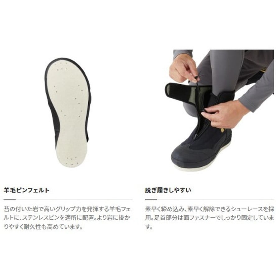 軽量鮎シューズに羊毛+ピンを装備。軽くて脱ぎ履きしやすいシューレースシステムをファスナー内部に搭載。足頸部分はメンファスナーでがっちりとロックします。また、耐滑性に優れた羊毛とステンレスのピンでがっちりとグリップ。オールシーズンで使えるよう内部構造は中丸に。3種類のインソールが標準装備されているので、サイズが変わっても足にピッタリと合わせることができます。★カラー:ブラック サイズ(cm):25.0 ソール:羊毛ピンフェルト タイプ:中丸 ※実物と色が違って見える場合があります。あらかじめご了承下さい。