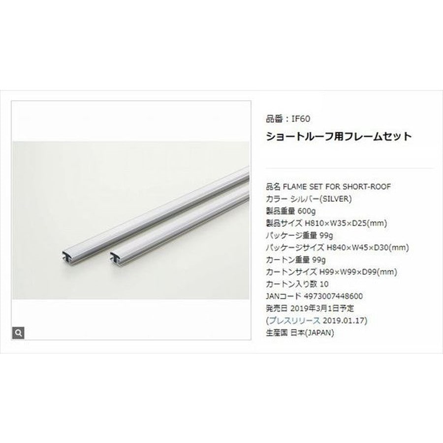 プリウス、アクア等ルーフの短いクルマに、IF14またはIF16を取り付けるため、標準品に替えて使用する短いタテフレームの2本セット。アルミ部分800mm(キャップ込みで810mm)。