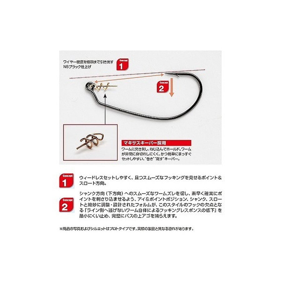 巻き刺すセットでワームズレ激減。ハードな使用に耐える!ワームをねじ込んでセットするマキサスキーパーを採用。スクリューの中心線を最初に突き刺してから回転させる“マキサスセット”で、比較的誰でも簡単にまっすぐワームのセットが可能。これまでワームのポテンシャルを損なう原因となっていた、セットズレから解放されます。スイミング時においては、ワームのヘッド部分がストラクチャーに接触しにくく、ウィードレス効果を発揮。比較的細めのワームにもマッチし、一般的なオフセットフック形状よりもベンドが緩く無理のないフォルムにより、強度が高いのが特徴。ノーシンカー、テキサスリグでのスイミングは特に高次元で対応します。
