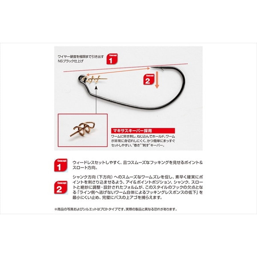 巻き刺すセットでワームズレ激減。ハードな使用に耐える!ワームをねじ込んでセットするマキサスキーパーを採用。スクリューの中心線を最初に突き刺してから回転させる『マキサスセット』で、比較的誰でも簡単にまっすぐワームのセットが可能。これまでワームのポテンシャルを損なう原因となっていた、セットズレから解放されます。スイミング時においては、ワームのヘッド部分がストラクチャーに接触しにくく、ウィードレス効果を発揮。比較的細めのワームにもマッチし、一般的なオフセットフック形状よりもベンドが緩く無理のないフォルムにより、強度が高いのが特徴。ノーシンカー、テキサスリグでのスイミングは特に高次元で対応します。