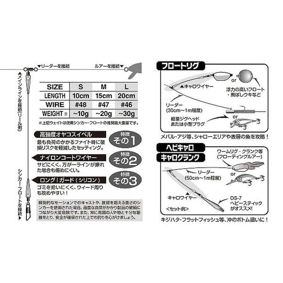 キャロ&フロート対応!ソルトウォーター専用キャロワイヤー。軽量ルアーでは本来届かないようなにプレゼンテーションできる遠投キャロ系リグ専用ワイヤー。ソルトウォーターでの使用を前提に各部チューニングを施したモデルです。ヘビーシンカーを使用した遠投&ボトム攻略はもちろん、大きめのフロートを使用すれば表層レンジやシャローエリアにも対応。おもにロックフィッシュやフラットフィッシュ攻略において新たなアプローチを実現!●ウィードをほぐしてスタックを回避する3×7susナイロンコートワイヤー採用。●ウィードレス性のよいロングiガードでスイベル周辺をガード。●シンカー優先の飛行姿勢となり、リーダーが絡みにくくロングキャストが可能。●オヤコサルカンは魚とのファイト時に最大強度が出る配置にカスタマイズ。●お好みのシンカーやフロートをセット可能。〇自重 S:0.8g M:1.4g L:2g※いずれもおよその値となります。フロートリグの浮力調整などにご参考に。★サイズ:L 入り数:2