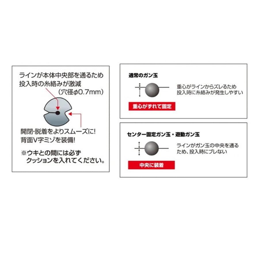 便利な遊動ガン玉に視認性を追加。●遊動ガン玉に蛍光塗装を施して視認性を追加。視認性のある遊動ガン玉です。水中でも良く見えるイエロー塗装を採用し、水中での仕掛けの落ちが一目瞭然です。●ゴム製被膜で衝撃が加わっても塗装が剥げにくい。イエローの被膜にはゴム素材を採用。通常の塗装では他物との接触で色剥げが生じますが、柔軟な素材で塗装することにより傷を軽減します。●割面は非塗装なので割れ目がわかりやすい。遊動ガン玉の外周部のみを塗装しています。ラインを挟み込む割り部の内側は非塗装となっているため、手に取った際に素早くラインを挟み込む位置が把握可能です。