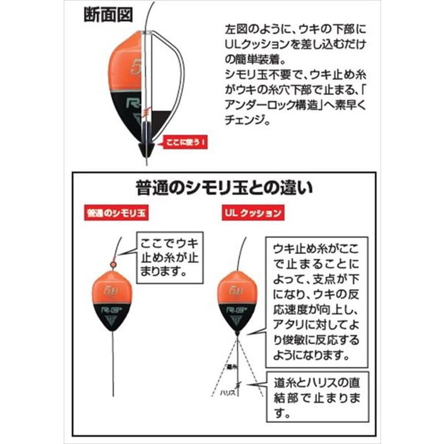 仕掛けを極限までシンプルに!ULシモリのプロフェッショナルモデル★入り数:5 ULシモリの機能にクッション性能を付加 ULクッションの特性と使い方のご注意 ウキの下穴径によって使い分ける3サイズ ※実物と色が違って見える場合があります。あらかじめご了承下さい。