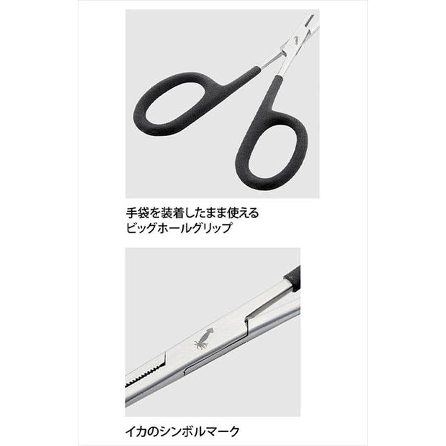ケンサキイカ、ヤリイカの等の墨袋はずしに最適。墨袋を掴みやすい先曲がりタイプ。手返しのいいノンストッパーレス仕様。滑り難いノンスリップコーティンググリップ。サビに強いステンレス製。★全長:約180mm 重量:約86g
