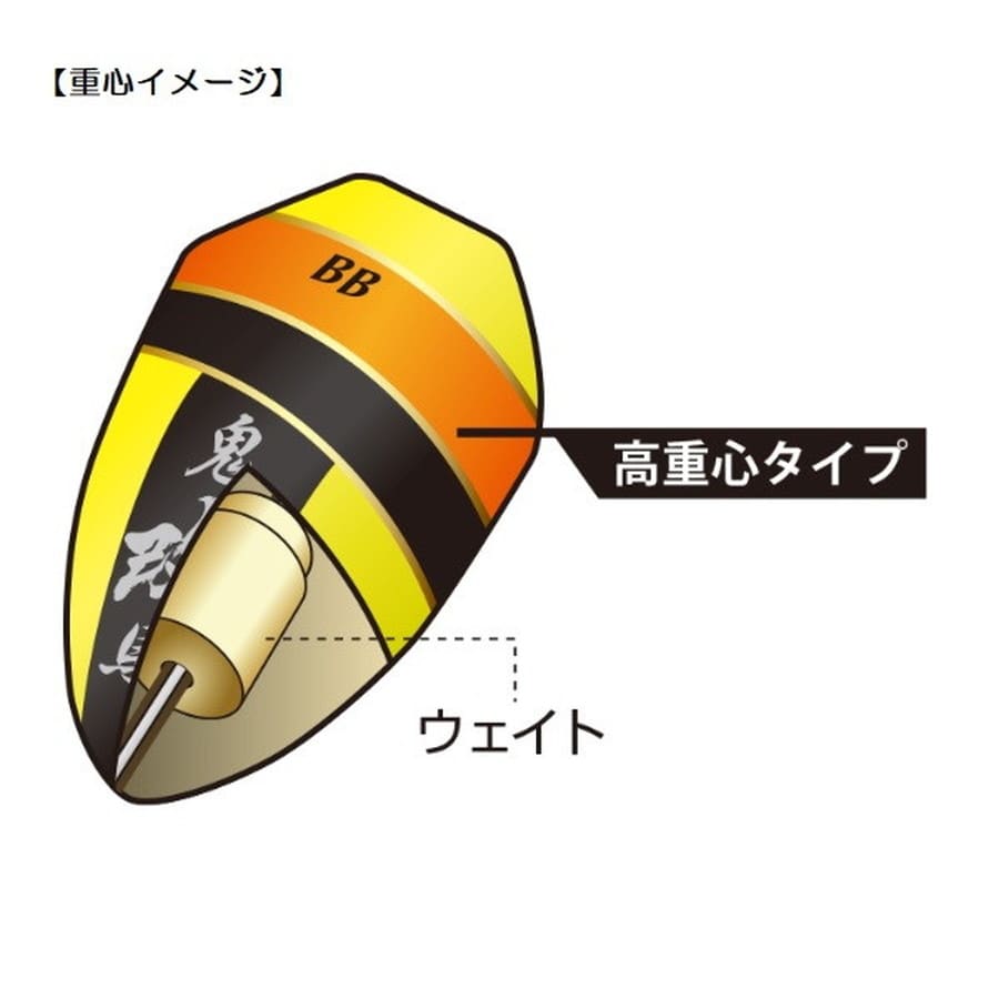 ウキ全体の馴染みが分かりやすい高重心タイプ。小さなアタリや潮の上滑りなどが分かりやすいよう二色塗りのヘッドを採用しました。鬼馬シリーズ特有のバット部のキバカラーは二枚潮や、仕掛けのトラブルなども視認することができます。