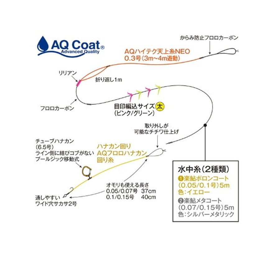 ●直線強力0.07号で1.25kg、0.15号で1.71kgを誇るハイパワー水中糸を使用した完全仕掛け。●天上糸には超高感度が体感できる「ハイテク天上糸NEO」を使用。●ハナカン回りには、耐久性の高いAQフロロハナカン回り糸を使用し、繰り返しの使用にも安心。●パッケージを開けたらすぐに使えるよう、ハナカン回り糸の長さを一般的な鮎のサイズに設定済み。