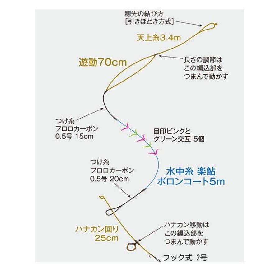 ●ハイパワー水中糸使用の完全仕掛け。中・後期の大鮎に対応できる強度重視の仕掛けです。●水中糸はAQコートにより、糸グセがつきにくく、クセがついても取れやすい特性を獲得。●天上糸には超高感度が体感できる「ハイテク天上糸NEO」、ハナカン回りには、耐久性の高いAQフロロハナカン回り糸を使用し、繰り返しの使用にも初期性能を保持します。●竿長9mに設定済。