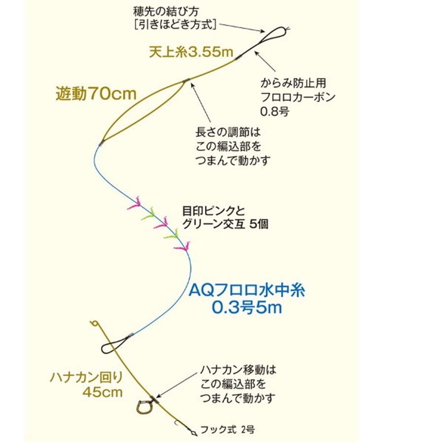 ●ハイパワー水中糸使用の完全仕掛け。中・後期の大鮎に対応できる強度重視の仕掛けです。●水中糸はAQコートにより、糸グセがつきにくく、クセがついても取れやすい特性を獲得。●天上糸には超高感度が体感できる「ハイテク天上糸NEO」、ハナカン回りには、耐久性の高いAQフロロハナカン回り糸を使用し、繰り返しの使用にも初期性能を保持します。●竿長9mに設定済。