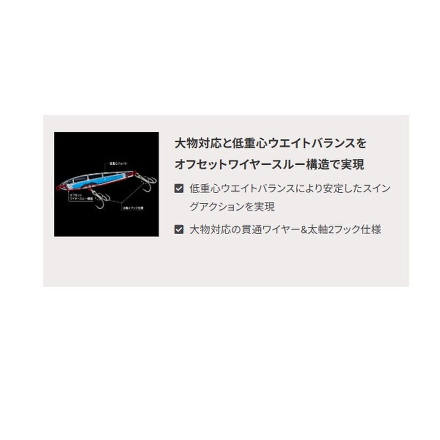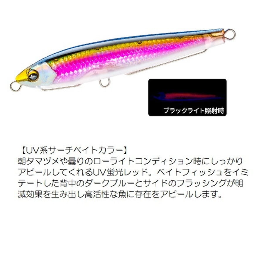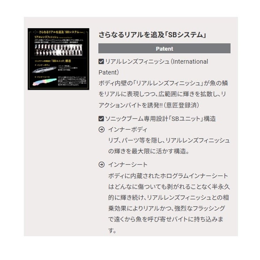 爆発的飛距離+レンズの閃光!(International Patent)遥か彼方のターゲットを狙い撃つ!!半永久的に輝くリアルレンズを搭載。遠浅エリアや水面直下狙いに最適なシンキングペンシル!●薄めのボディ形状で風を切り裂く抜群の遠投性能●浮き上がりが速い設定により、遠浅エリアや水面直下をスローでじっくり狙える●ラインを引っ張りながらバックスライドローリングフォールするので着底が分かり易い