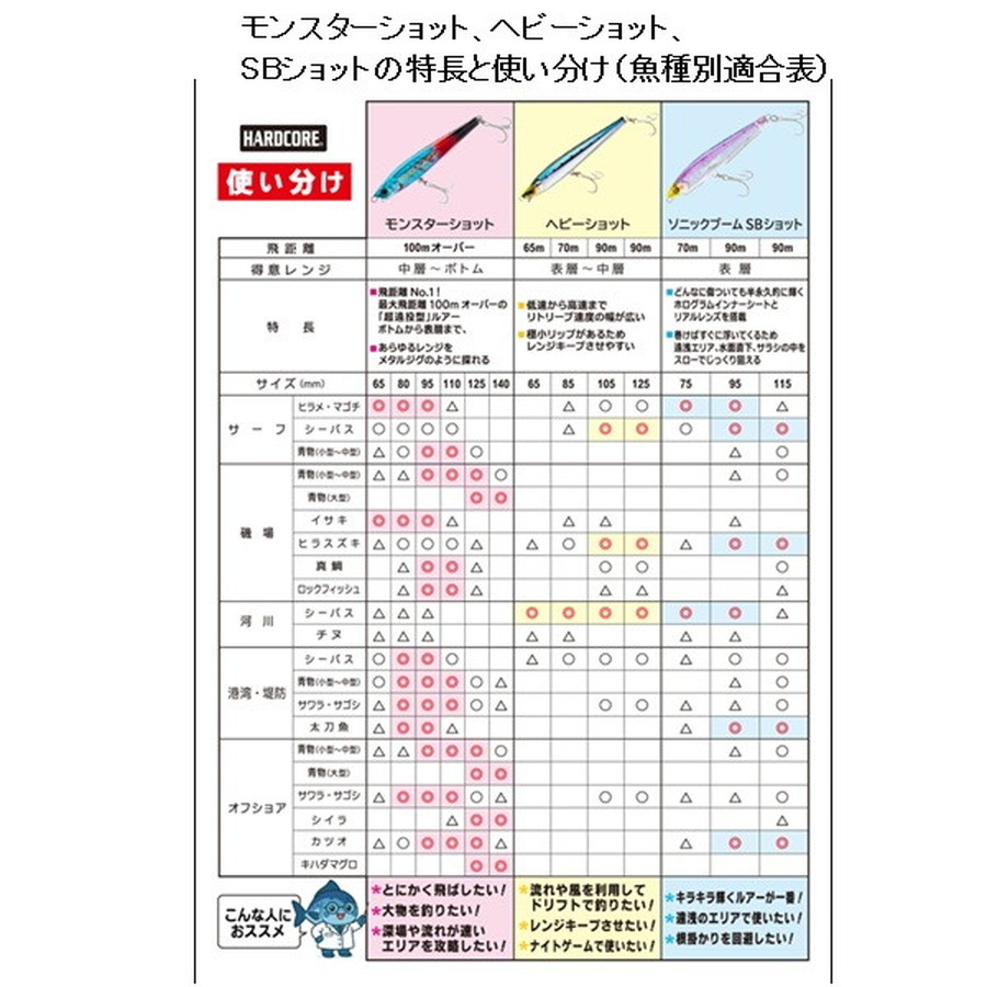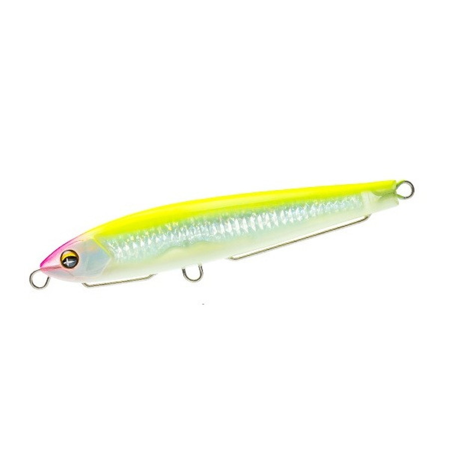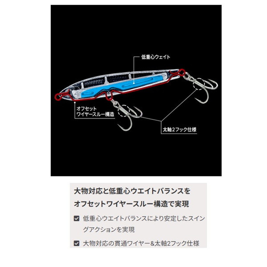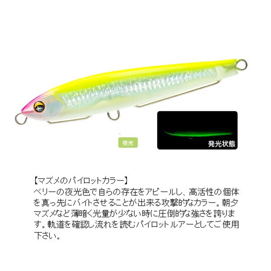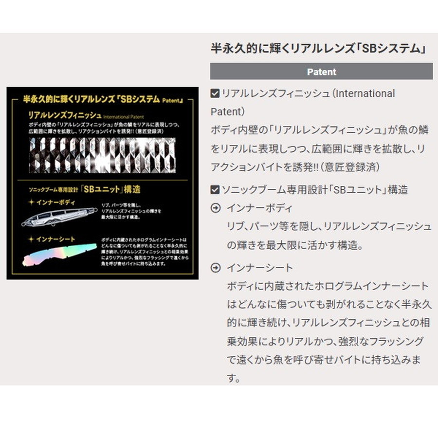 爆発的飛距離+レンズの閃光!(International Patent)遥か彼方のターゲットを狙い撃つ!!半永久的に輝くリアルレンズを搭載。抜群の遠投性能でスローに巻ける。遠浅エリアや水面直下狙いに最適なシンキングペンシル!●薄めのボディ形状で風を切り裂く抜群の遠投性能●浮き上がりが速い設定により、遠浅エリアや水面直下をスローでじっくり狙える●ラインを引っ張りながらバックスライドローリングフォールするので着底が分かり易い