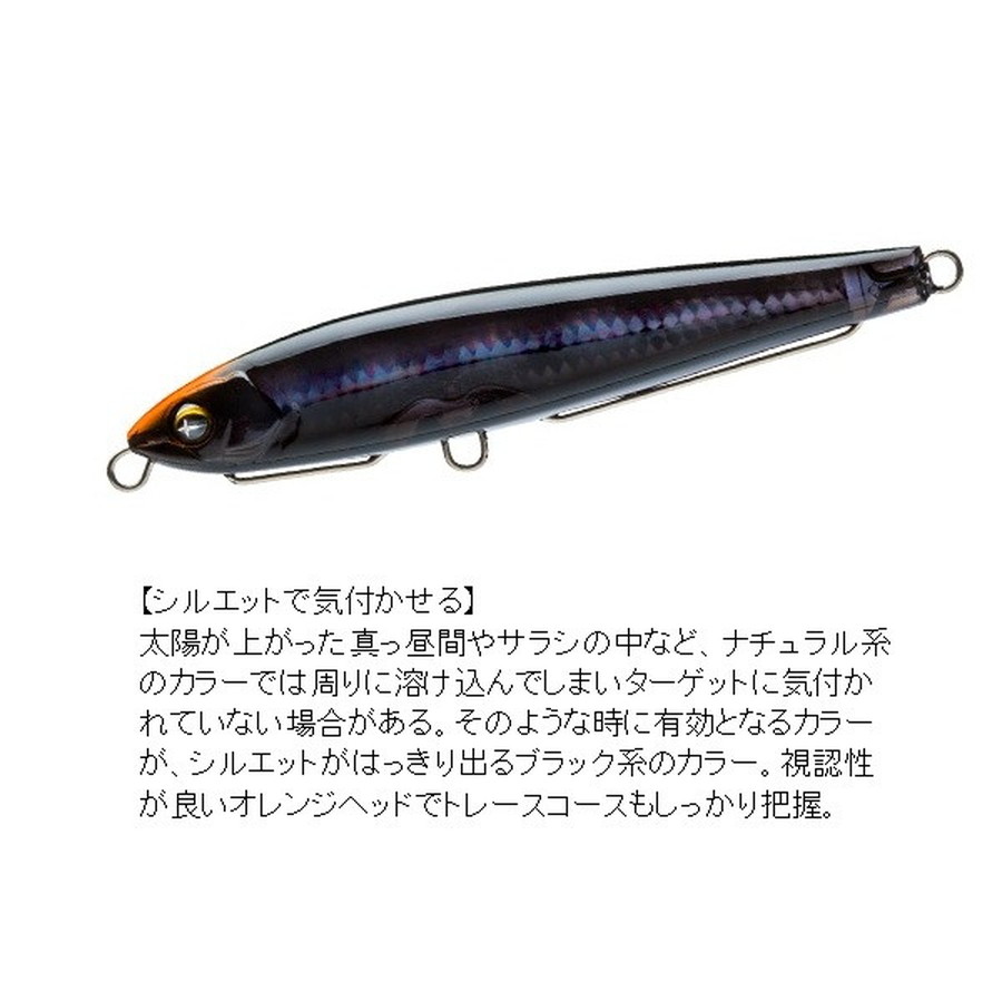 爆発的飛距離+レンズの閃光!(International Patent)遥か彼方のターゲットを狙い撃つ!!半永久的に輝くリアルレンズを搭載。抜群の遠投性能でスローに巻ける。遠浅エリアや水面直下狙いに最適なシンキングペンシル!●薄めのボディ形状で風を切り裂く抜群の遠投性能●浮き上がりが速い設定により、遠浅エリアや水面直下をスローでじっくり狙える●ラインを引っ張りながらバックスライドローリングフォールするので着底が分かり易い