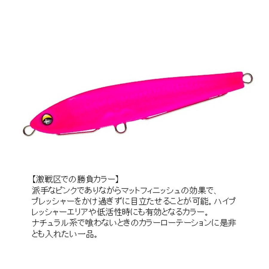 爆発的飛距離+レンズの閃光!(International Patent)遥か彼方のターゲットを狙い撃つ!!半永久的に輝くリアルレンズを搭載。抜群の遠投性能でスローに巻ける。遠浅エリアや水面直下狙いに最適なシンキングペンシル!●薄めのボディ形状で風を切り裂く抜群の遠投性能●浮き上がりが速い設定により、遠浅エリアや水面直下をスローでじっくり狙える●ラインを引っ張りながらバックスライドローリングフォールするので着底が分かり易い