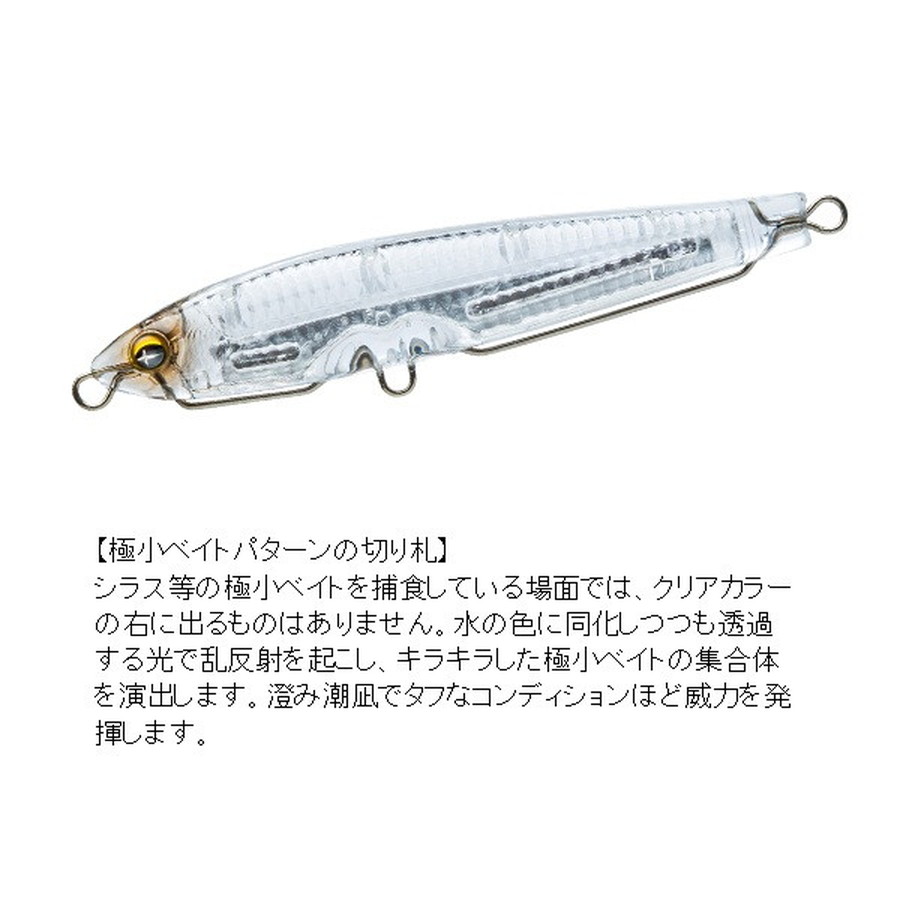 爆発的飛距離+レンズの閃光!(International Patent)遥か彼方のターゲットを狙い撃つ!!半永久的に輝くリアルレンズを搭載。抜群の遠投性能でスローに巻ける。遠浅エリアや水面直下狙いに最適なシンキングペンシル!●薄めのボディ形状で風を切り裂く抜群の遠投性能●浮き上がりが速い設定により、遠浅エリアや水面直下をスローでじっくり狙える●ラインを引っ張りながらバックスライドローリングフォールするので着底が分かり易い