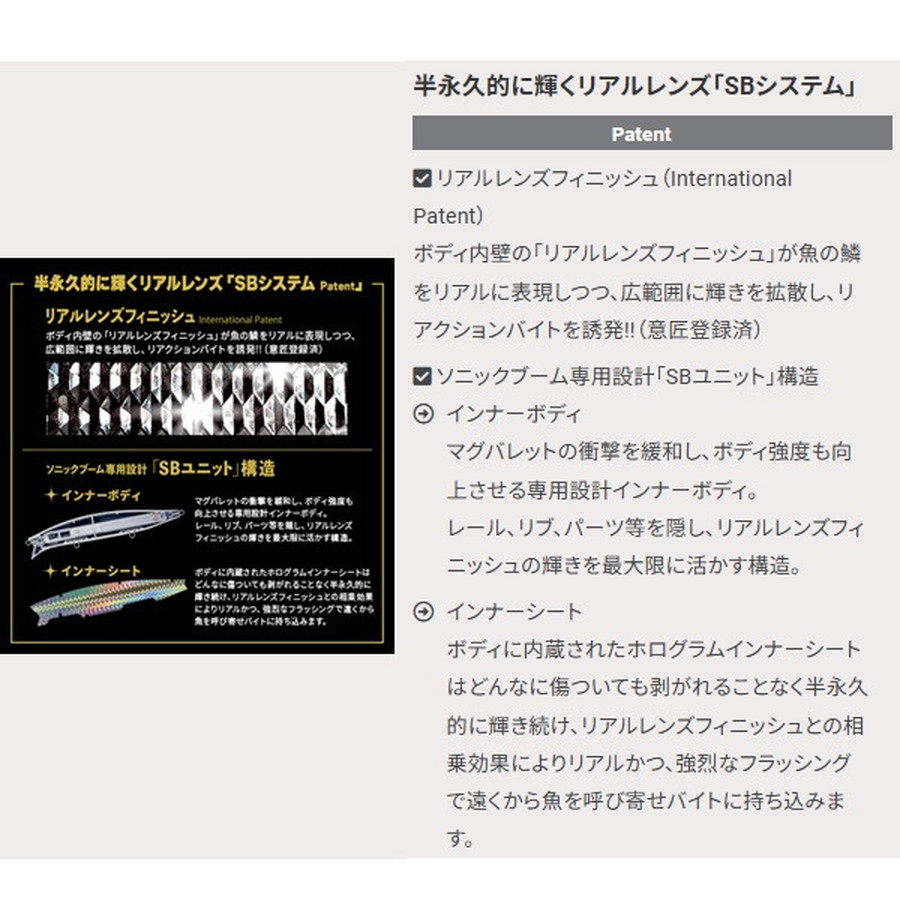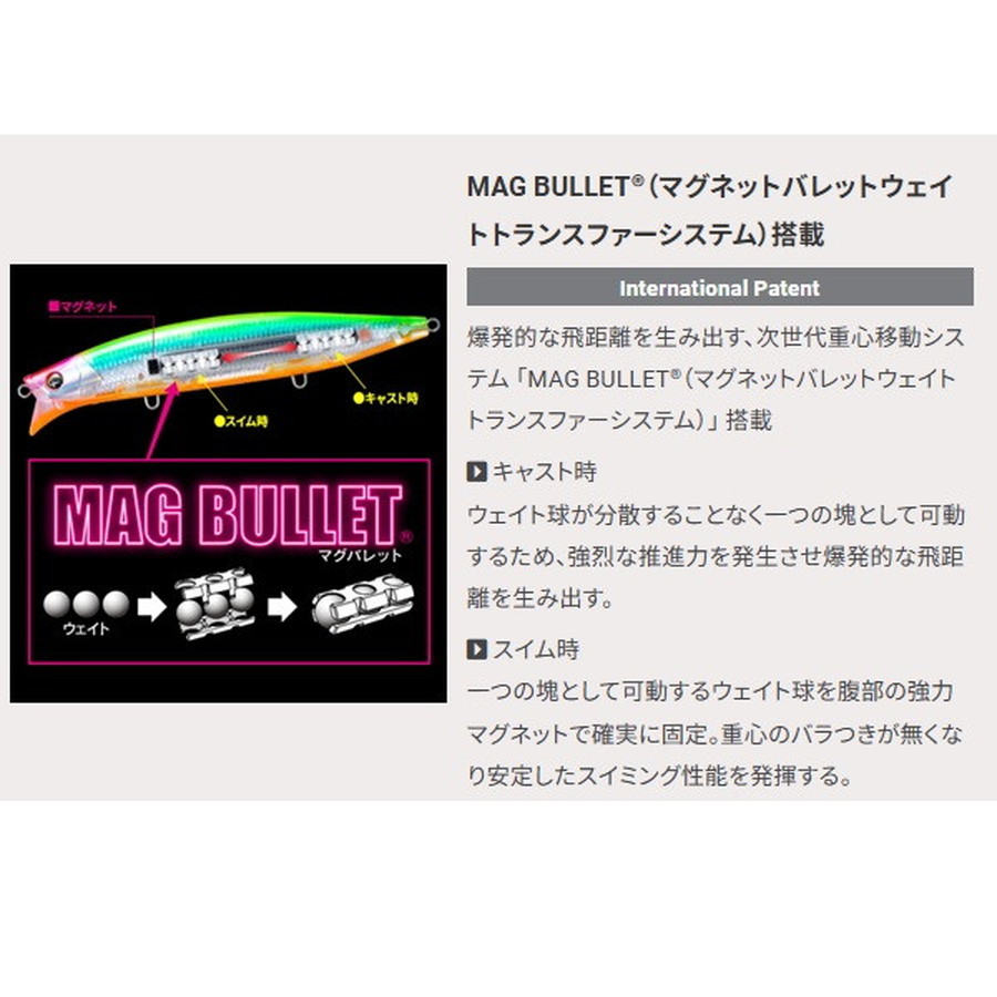 爆発的飛距離+レンズの閃光!(International Patent)遥か彼方のターゲットを狙い撃つ!!ランカー専用ウェイクベイト●爆発的な飛距離を生み出す次世代重心移動システム【マグバレットInternational Patent】搭載●ボディ強度の確保とリアルレンズフィニッシュの輝きを最大限生かす【SBユニットPatent】構造●リトリーブスピードとラインの角度調整で水面直下から50cm までを自在に操れるビッグウェイクミノー