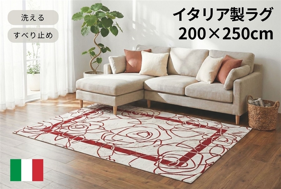 イタリア製ラグ カメリア 200×250cm (アイボリーレッド)