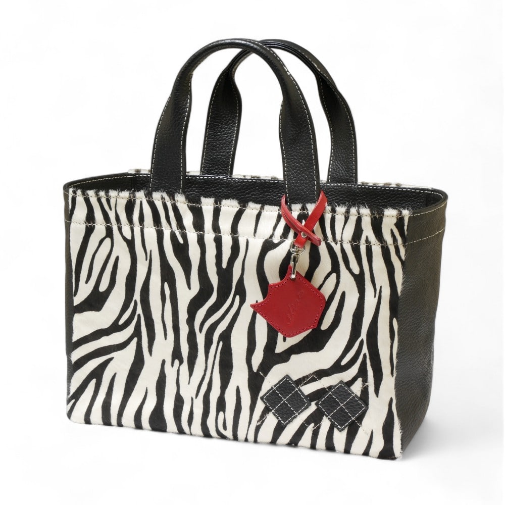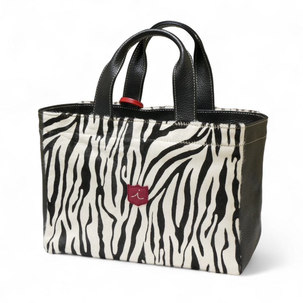 ゴルフラウンドを彩る大胆なゼブラ柄のハラコ調革トートバッグ