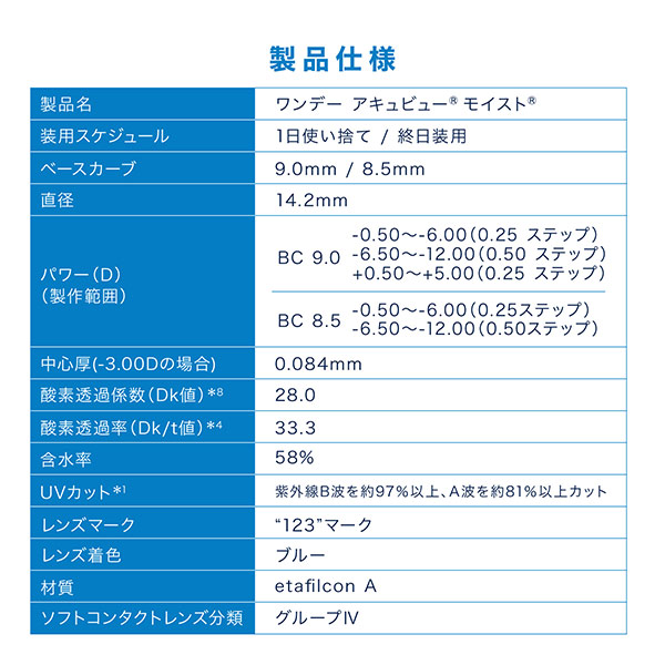 | ワンデーアキュビューモイスト30枚/90枚 レンズスペック | |