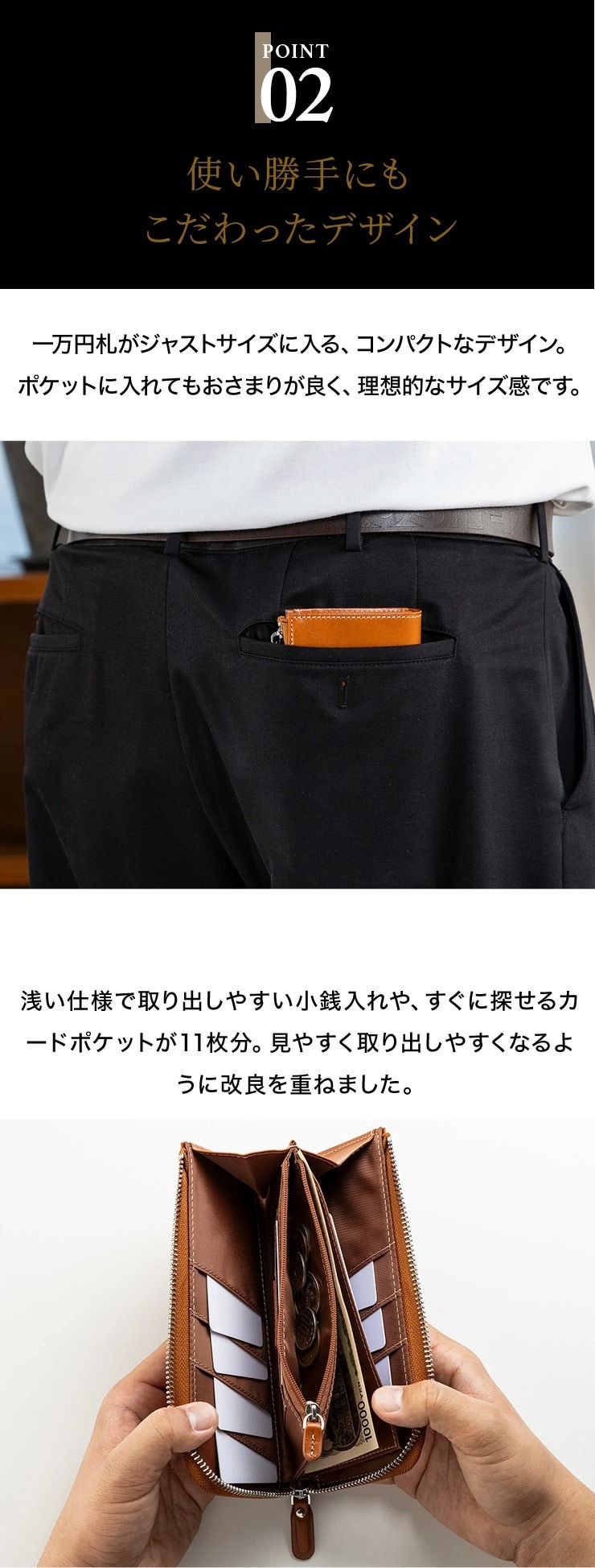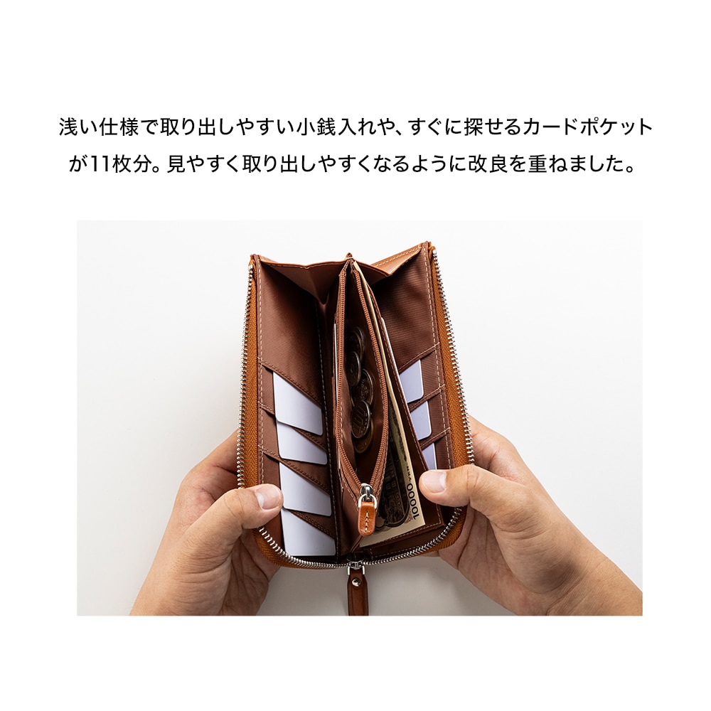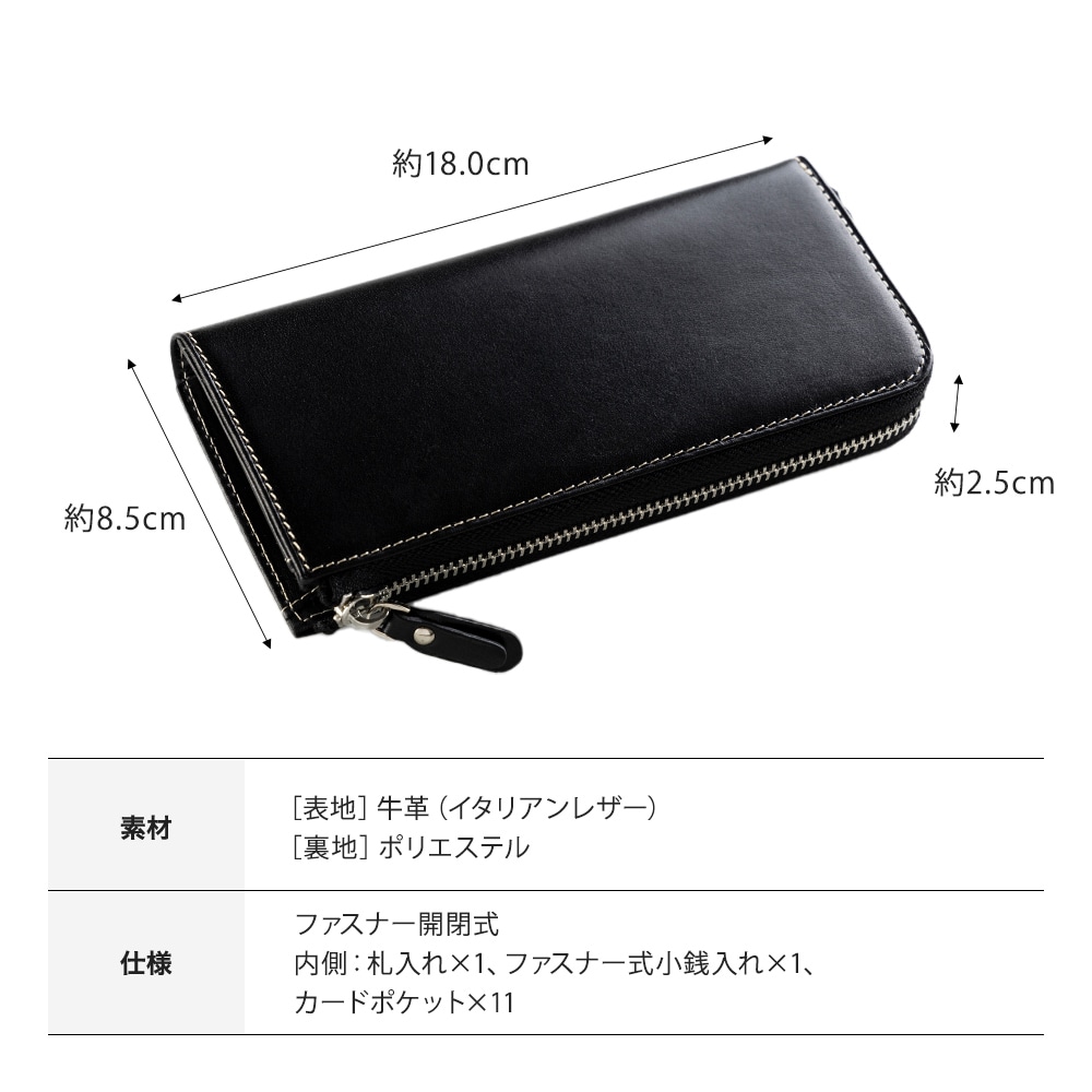 仕様 ファスナー開閉式、内側:札入れ×1、ファスナー式小銭入れ×1、カードポケット×11