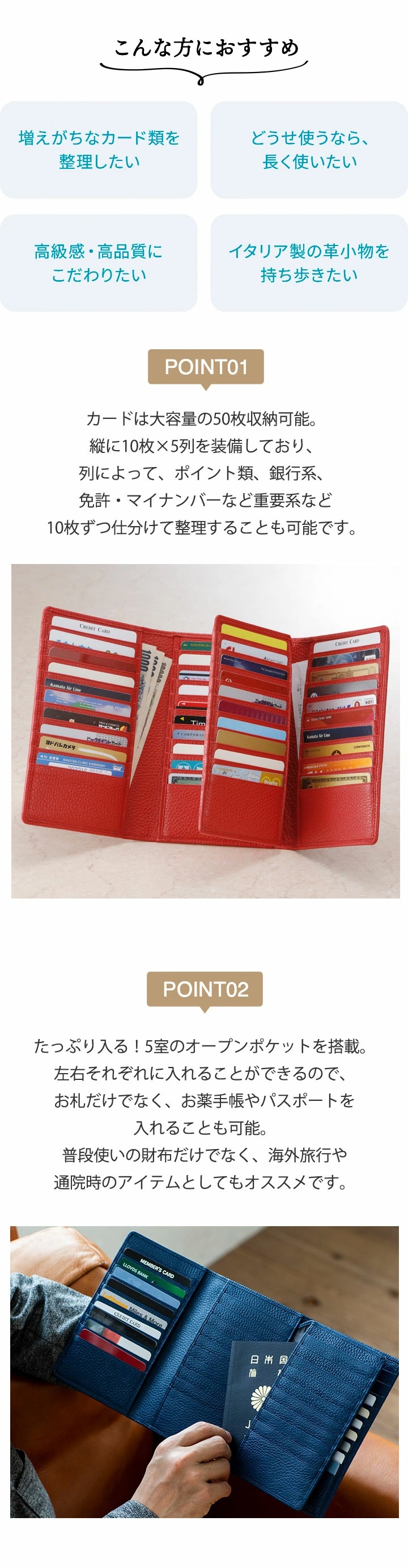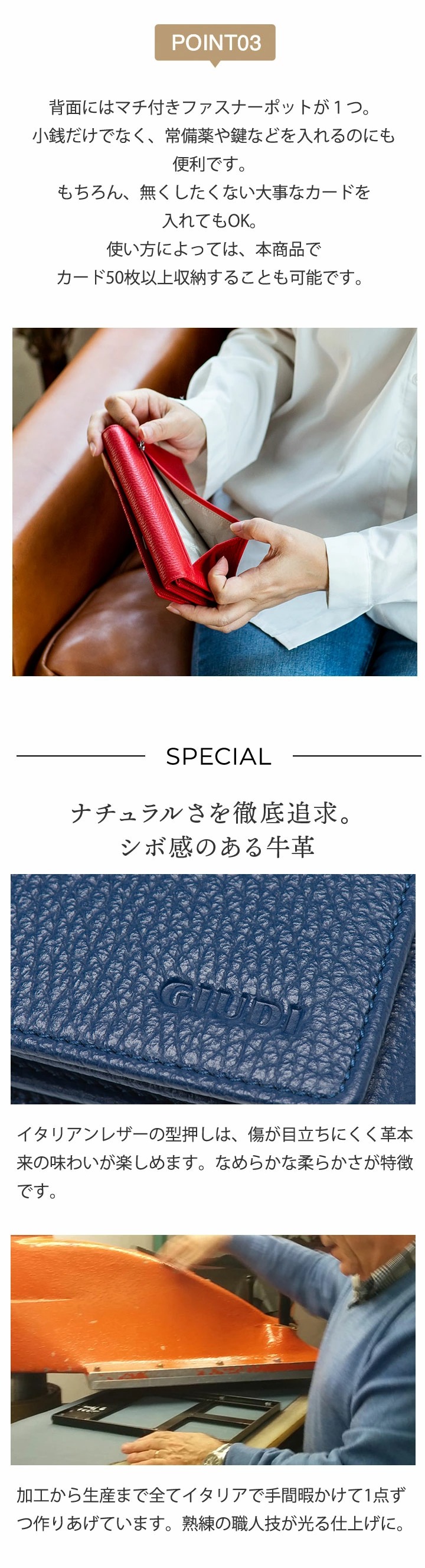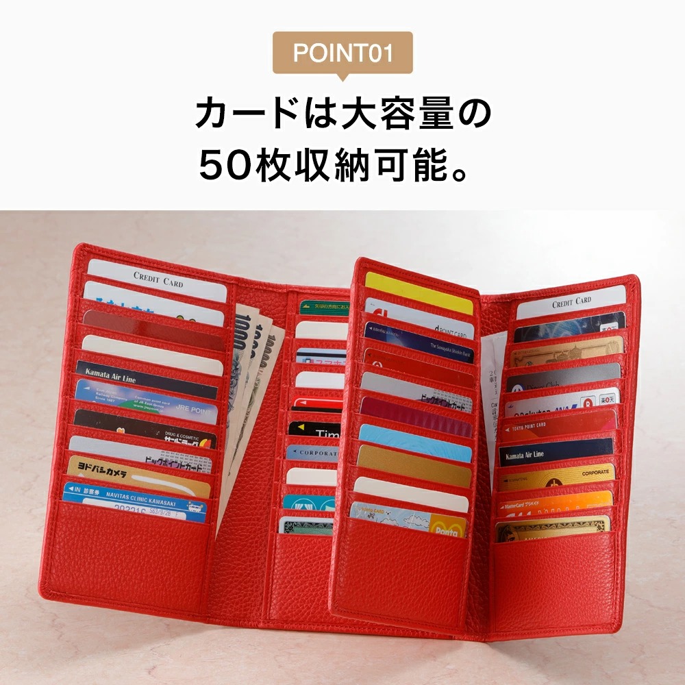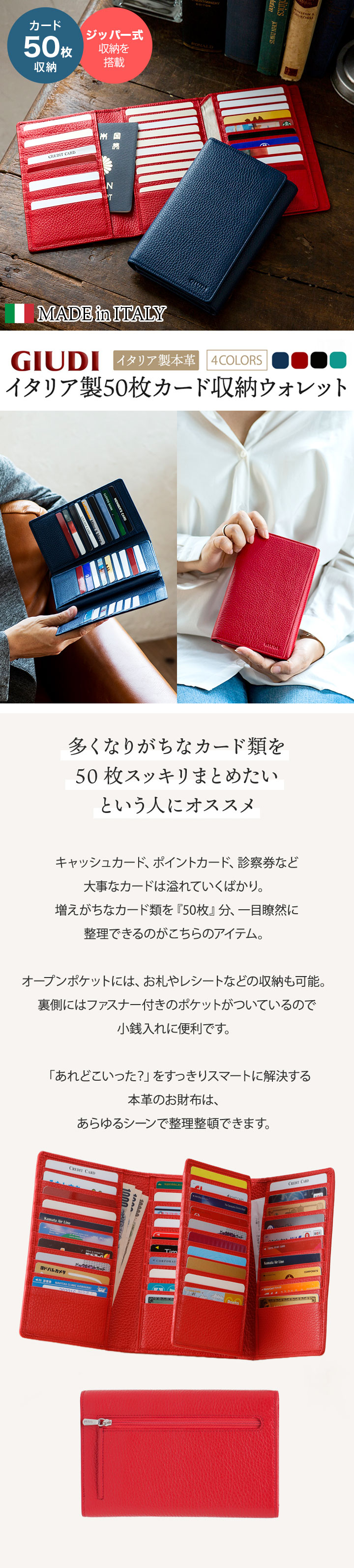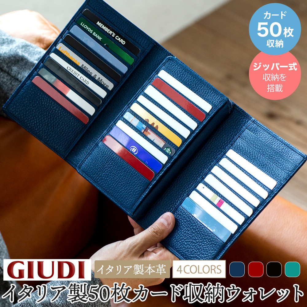 ブランド イタリア製 50枚カード収納 本革 ウォレット[GIUDI/ジウディ] 素材 牛革 [裏地]ポリエステル サイズ (約)縦18×横13×マチ3cm 重さ (約)230g 仕様 カードポケット×50、ファスナー式小銭入れ×1、オープンポケット×5 製造 イタリア