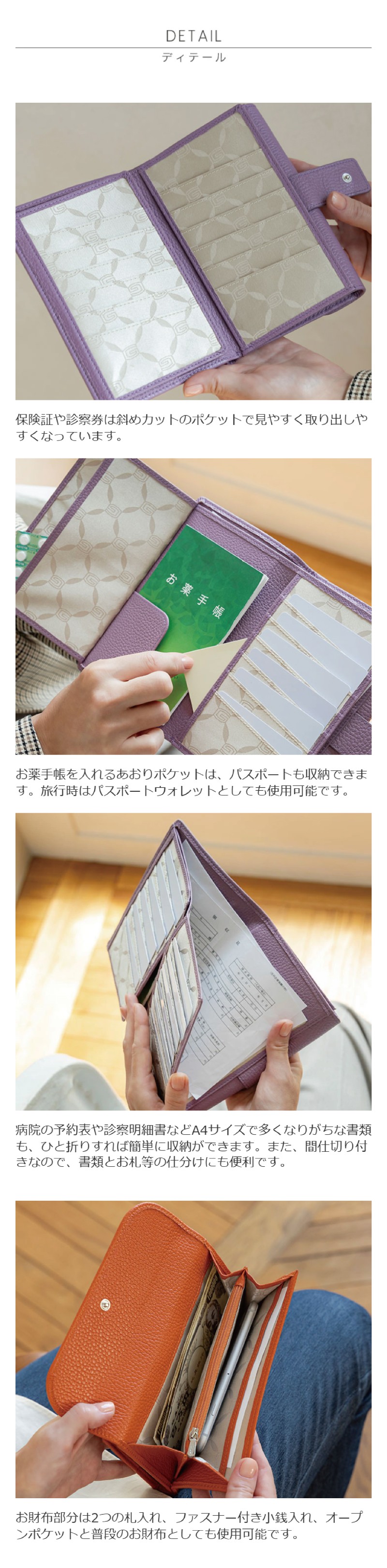 仕様 札入れ×2、ファスナー小銭入れ×1、オープンポケット×3 カードポケット×12、お薬手帳用あおりポケット×1、書類用ポケット(A5サイズ)×1