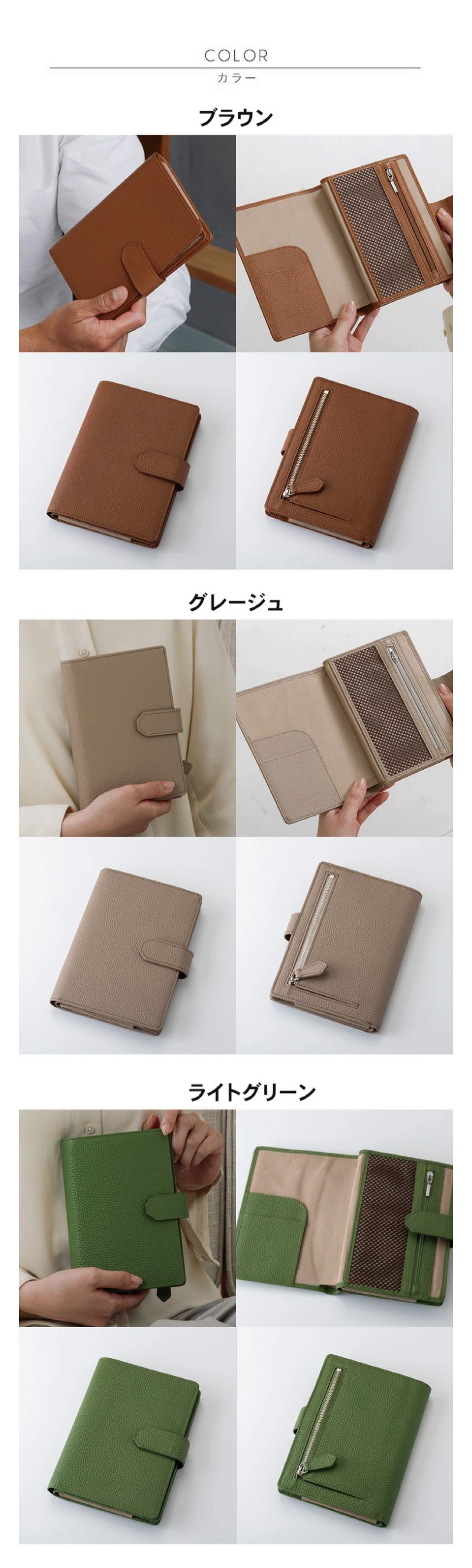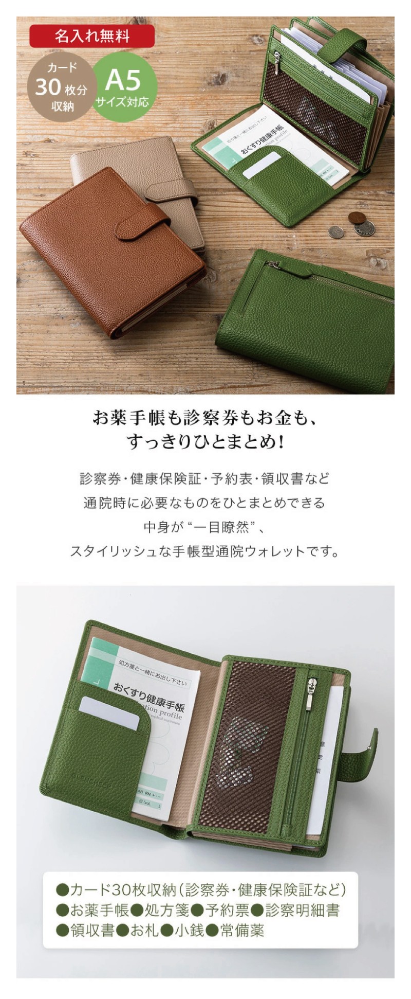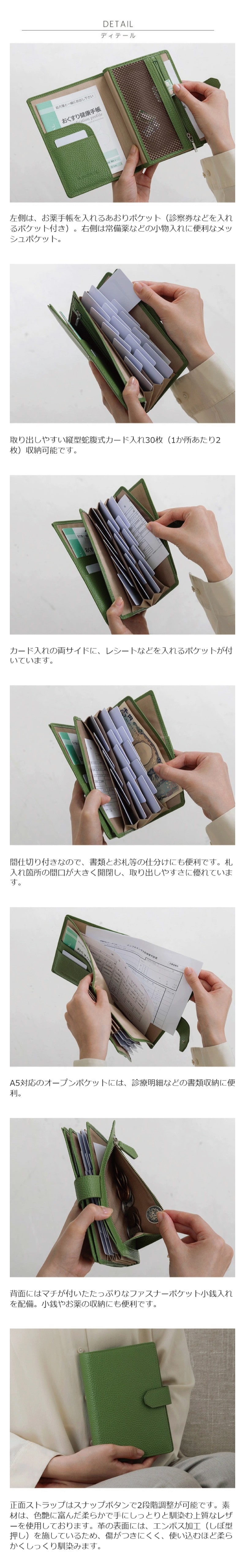 仕様 内側:蛇腹式カードポケット×15、札入れ×2、お薬手帳用あおりポケット×1、オープンポケット×2、メッシュファスナーポケット×1、A5対応オープンポケット×1