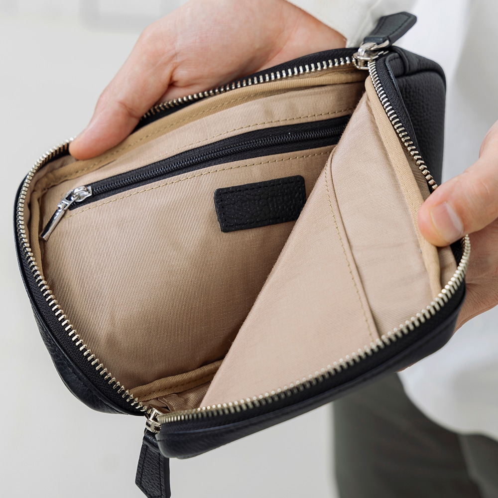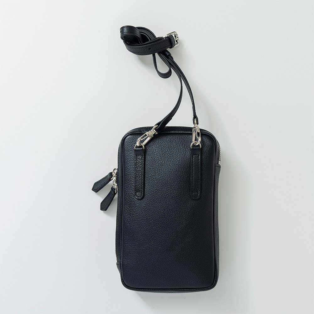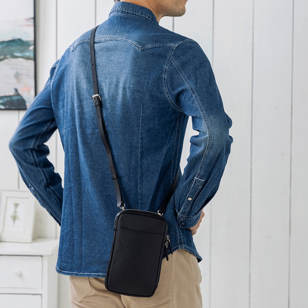 スマホと長財布などの必需品をひとまとめに携帯できるレザー使いのショルダーポーチです。 必要最低限の荷物を収納でき、気軽に持って出かけられる身軽さを備えています。 革の表面には、エンボス加工(シボ型押し)を施しているため、傷が目立ちにくく、使い込むほど柔らかくしっくり馴染みます。 長財布とスマホが入るサイズ感で、スマートキー、エチケット用品等も収納しやすく内側ポケットも備えております。 便利な2WAY仕様。ショルダーベルトは着脱可能で、背面のベルトループ付きなのでベルトポーチとしてもお使い頂けます。