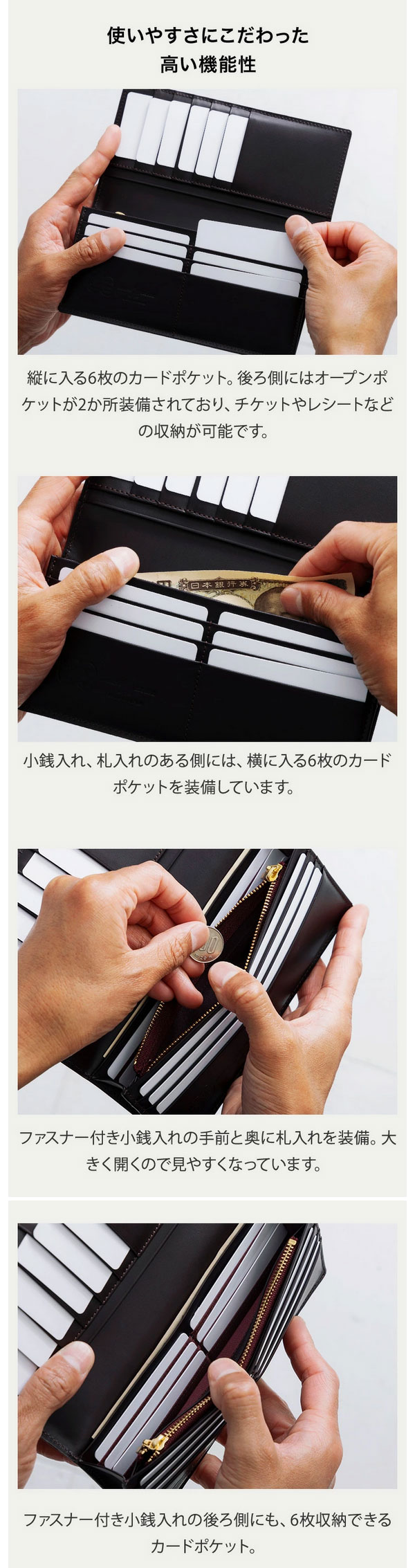 仕様 オープンポケット×2、ファスナー小銭入れ×1、 札入れ×3、カードポケット×18 (隠しカードポケット×6含む)