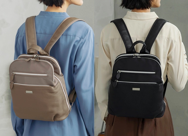 普段使いに最適なサイズ感で、ラウンドファスナー式の開きやすい三層構造となっており、荷物の整理に便利です。