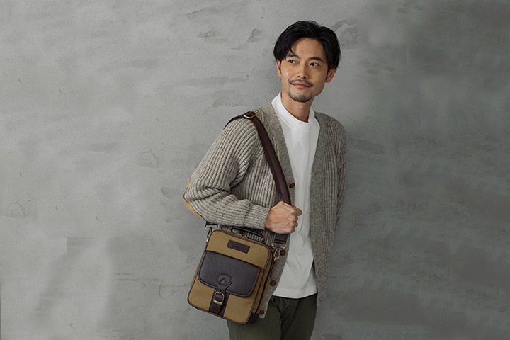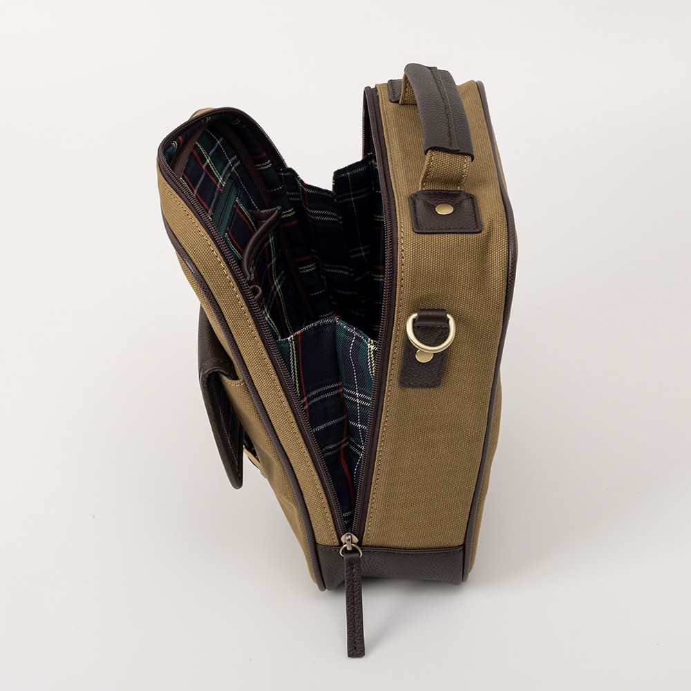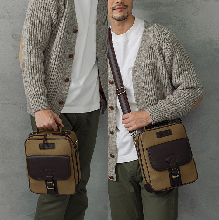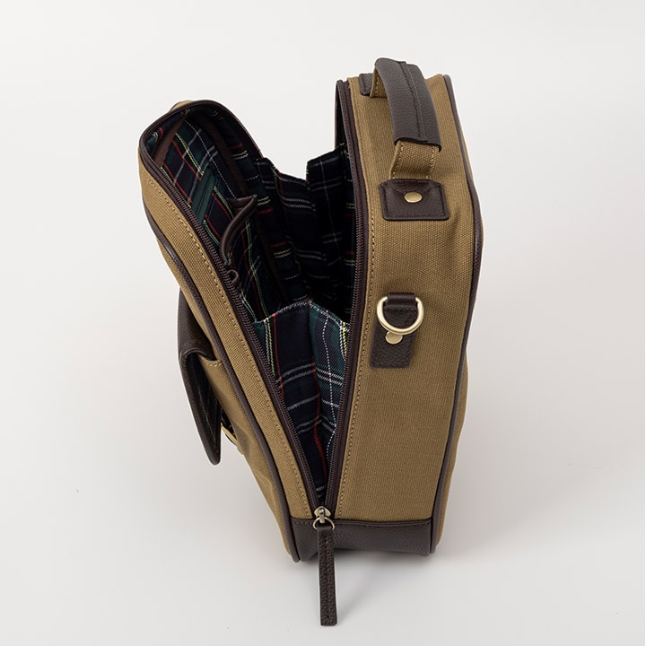 ブラウン系のカラーでまとめた上品な雰囲気と、 ライニングのタータンチェック柄が英国伝統スタイルを印象づけます。