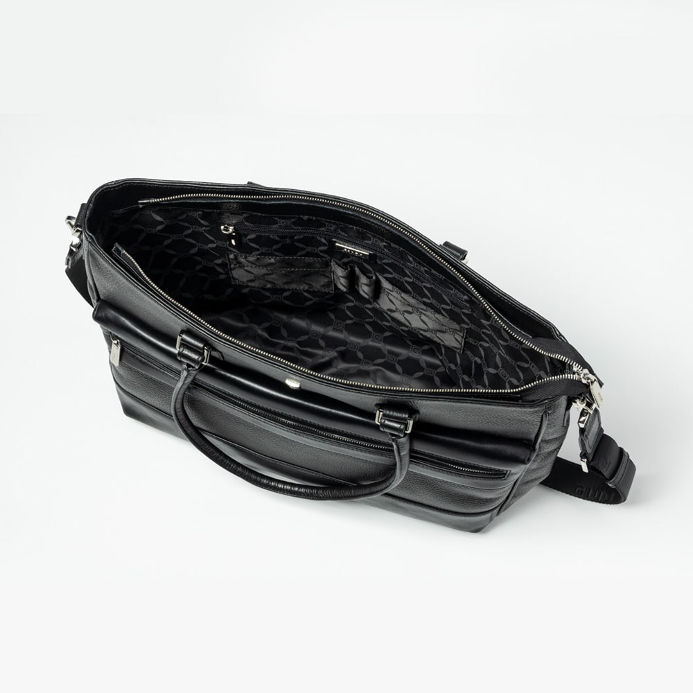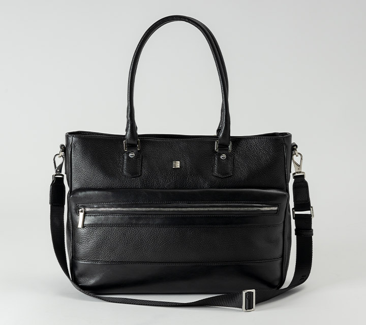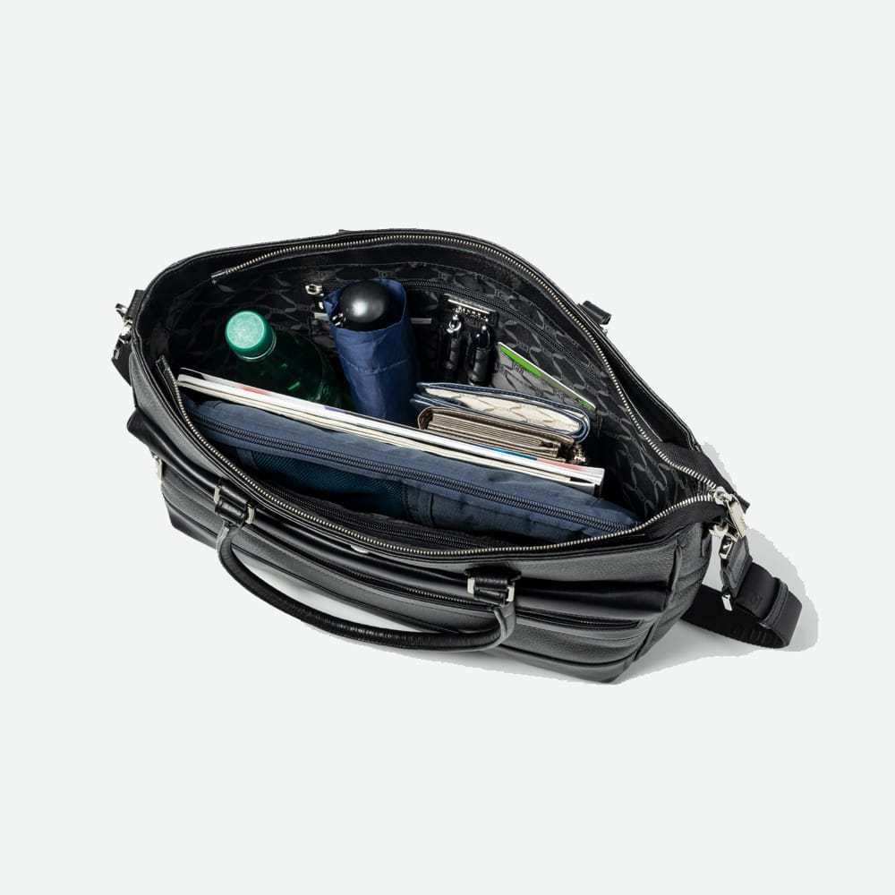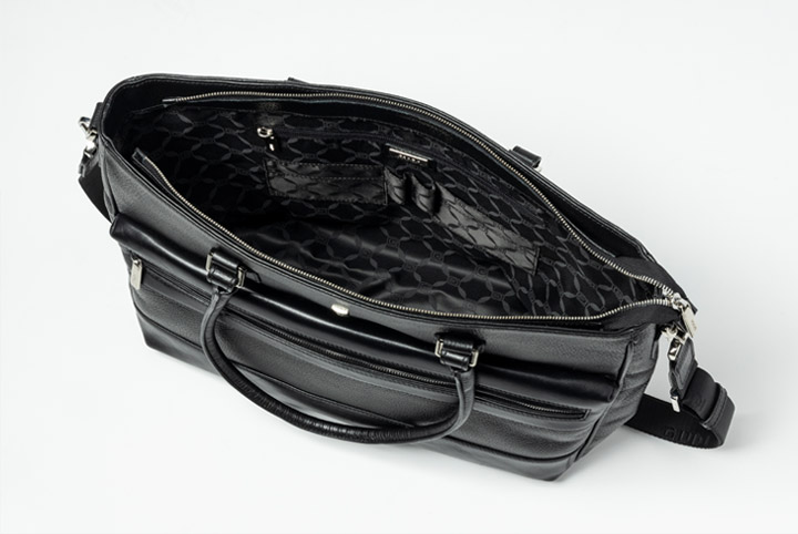4枚のカード、2本のペン、小物の収納が出来るファスナーポケットを2か所装備。 ペットボトル、ファイル、ノートPCも収納可能です。