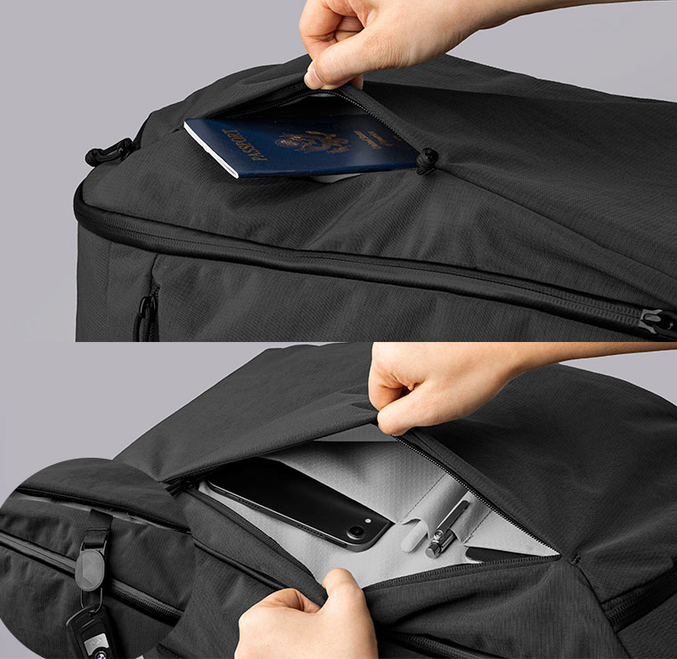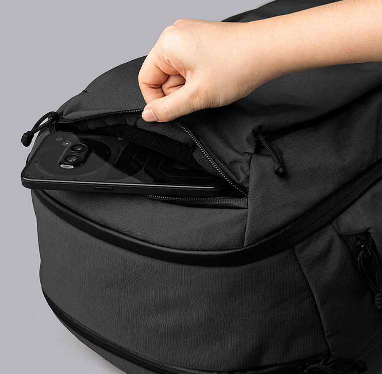 前面上部には携帯やサングラスなどのサッと取り出したいものに便利なファスナーポケット。