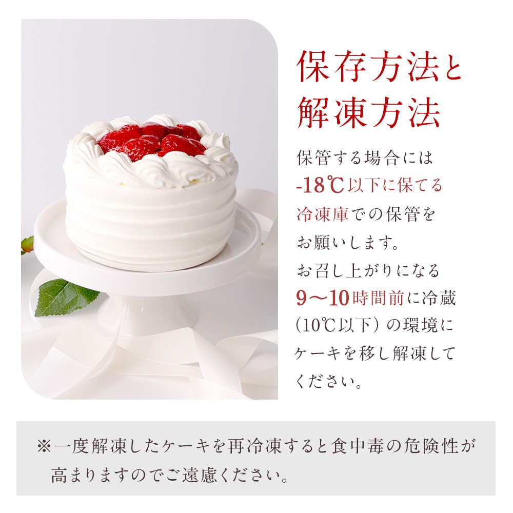 冷蔵の場合は10℃以下、冷凍の場合は-18℃で保管してください。 一度解凍したケーキを再び冷凍すると食中毒の危険性が高くなりますので、再冷凍はおやめください。 |
