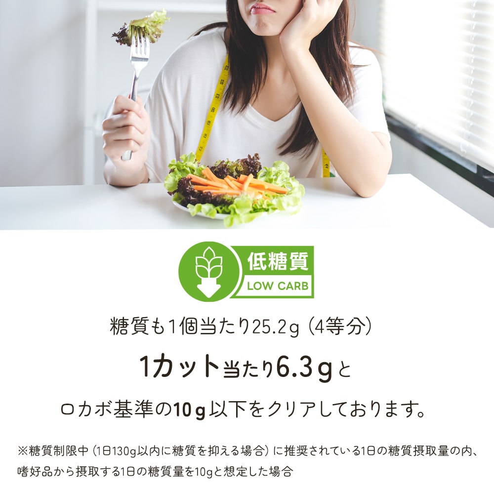 糖質も1個当たり25.2g4等分1カット当たり6.3gとロカボ基準の10g以下をクリアしております。