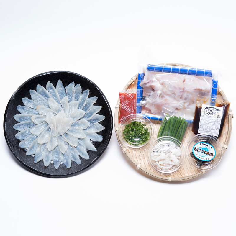 ●内容:とらふぐ刺身約120グラム、とらふぐあら約250グラム、とらふぐ皮・身皮約50グラム、とらふぐ焼ヒレ、ポン酢75ml、ネギ、もみじおろし