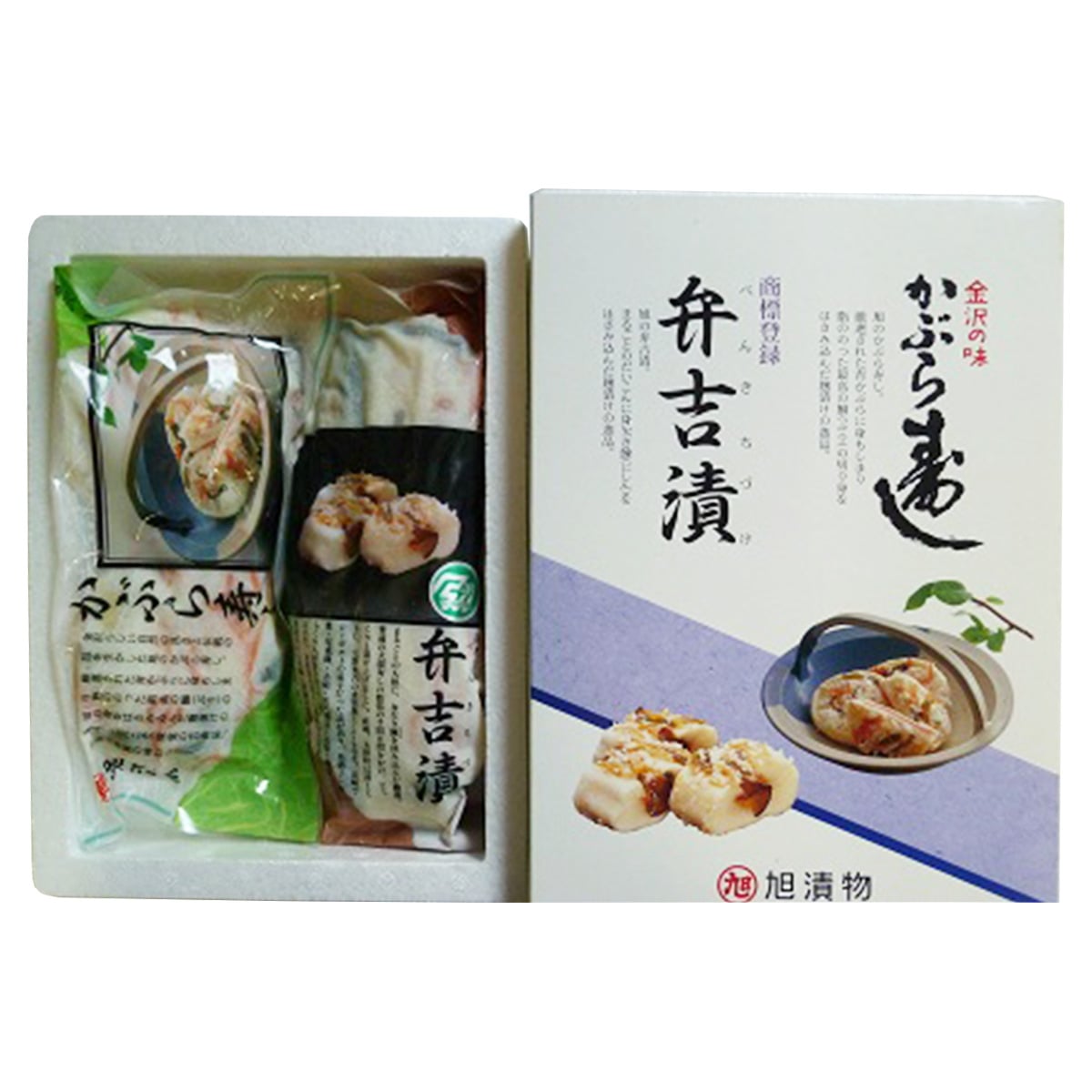 石川県産青かぶらに、塩漬けした鰤の切り身を挟み込み、自家製糖化酒麹床で氷温熟成製法で漬け上げた「かぶら寿し」と、旭漬物オリジナル商品の、一本漬大根寿しの詰合せギフトです。弁吉漬は、石川県産だいこんに、身欠き鰊(ニシン)を挟み込んで、糖化酒麹床で氷温熟成製法で漬け上げます。弁吉漬は2017年の石川県優良観光土産品コンクールにおいて、石川県観光連盟理事長賞を受賞しました。人気商品の詰合せですのでご贈答にも大変喜ばれる商品です。