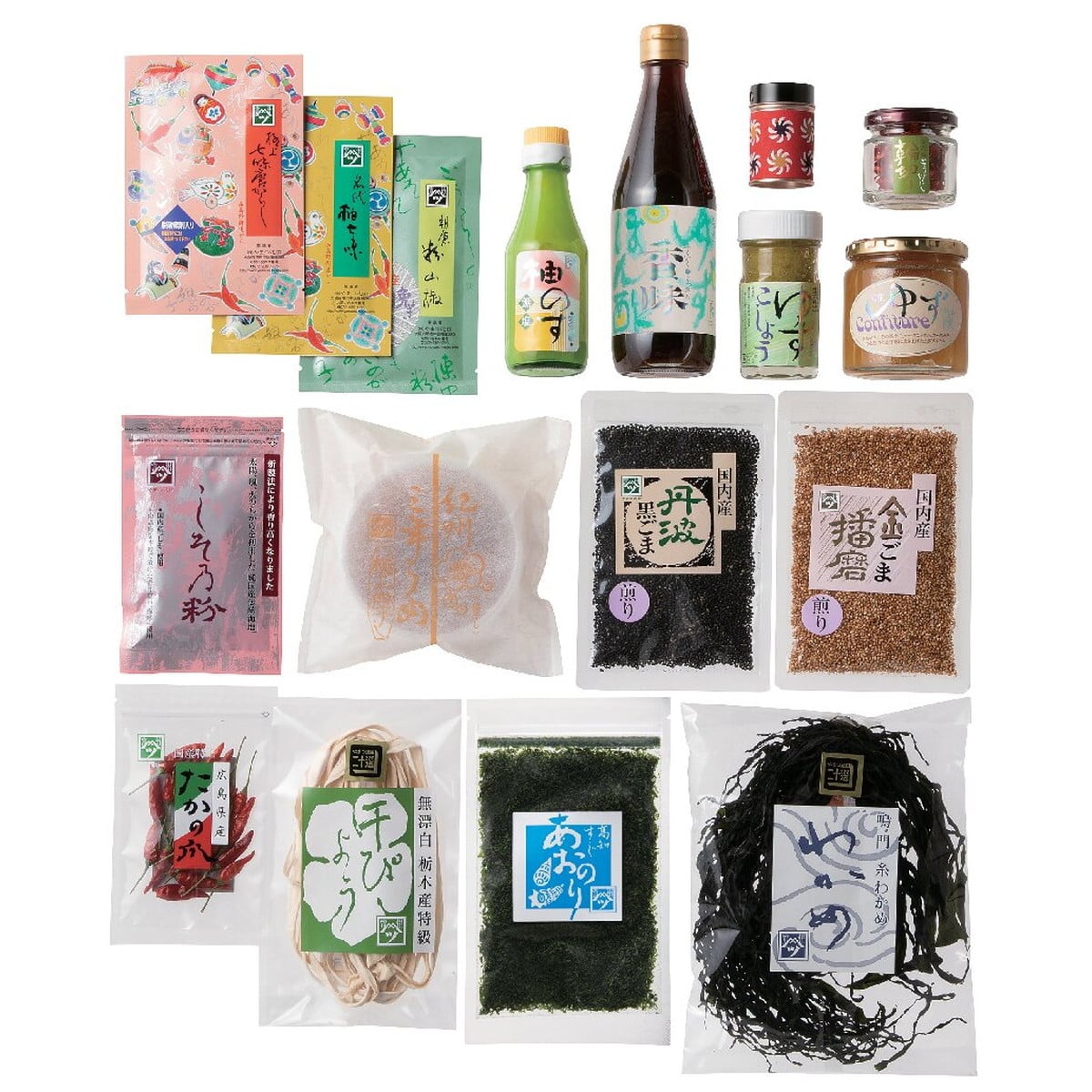 ●数量・内容:極上七味西高野街道から10g、名代柚七味西高野街道から15g、石臼挽き朝倉粉山椒5g、高知糸すじ青のり4g、しその粉10g、実生ゆずぽん酢360ml、実生柚のす150ml、国内産金ごま播磨いり・国内産丹波黒いりごま各35g、実生ゆずこしょう60g、実生柚子ジャム250g、紀州三年梅120g、たかの爪5g、鳴門わかめ20g、干ぴょう25g、国内産輪切り唐辛子6g、千代の缶×1