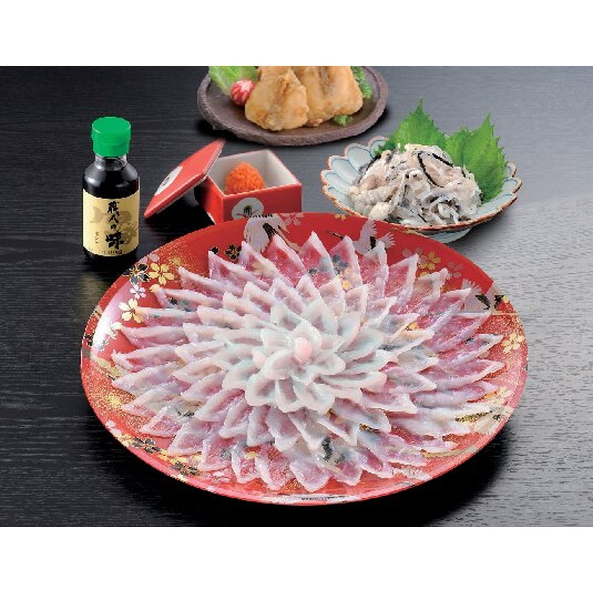 ●数量・内容:とらふぐ刺身(30cm皿)120g、とらふぐ皮60g、ふぐ唐揚げ(油調済・骨付)80g、ふくポン酢100ml、もみじおろし10g×4
