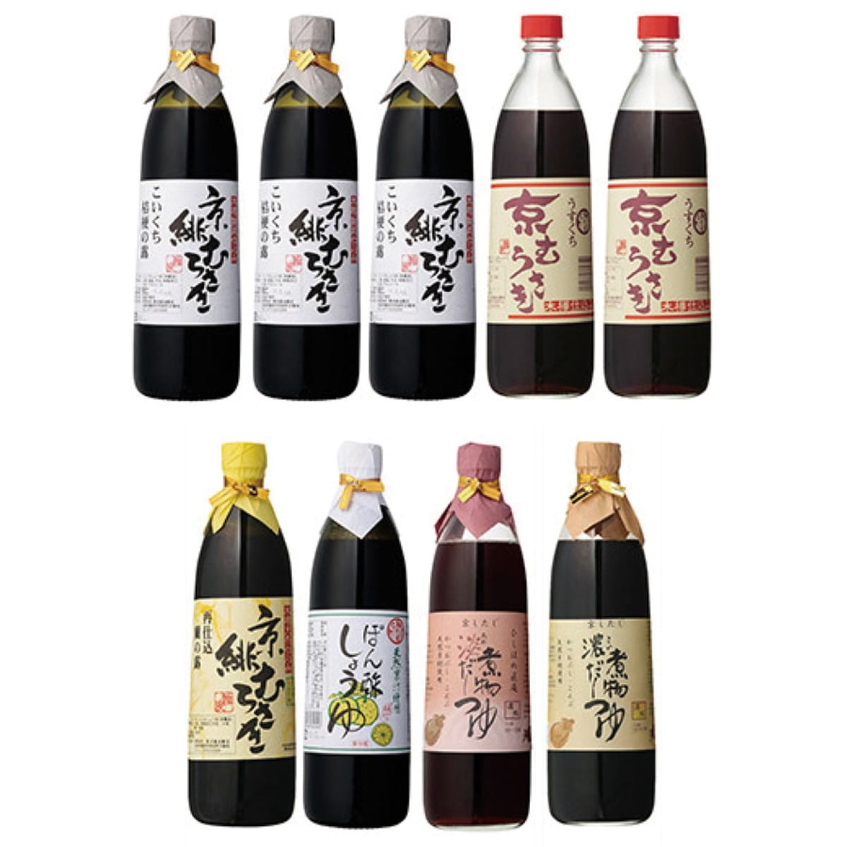 ●数量・内容:京緋むらさき桔梗の露(こいくち)900ml×3、京むらさき(うすくち)900ml×2、京緋むらさき蘭の露(再仕込)・ぽん酢しょうゆ・淡だし煮物つゆ(濃縮10倍タイプ)・濃だし煮物つゆ(濃縮10倍タイプ)各900ml
