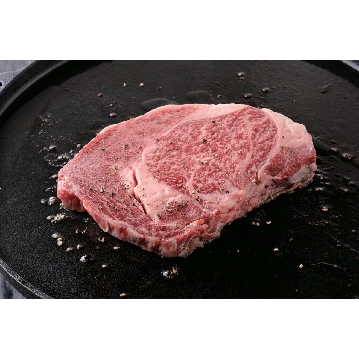 「神戸牛 ロースステーキ用」 厚みのあるロースのステーキはシンプルに塩コショウで味付けするだけで身震いするほどおいしく、ナイフを入れればスッと肉に刃先が沈んでいきます。ほんのりとした甘みをもつ脂と、豊かな風味の赤身のバランスも素晴らしいので、わさび醤油や、柚子胡 椒など、和の香辛料との相性も抜群です。日本屈指の銘柄和牛。