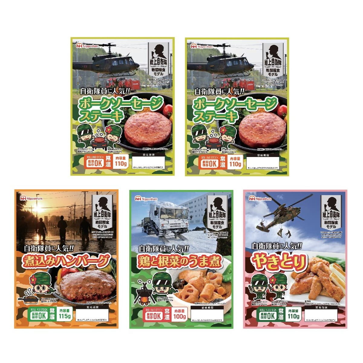 ●数量・内容:ポークソーセージステーキ110g×2、煮込みハンバーグ115g、鶏と根菜のうま煮100g、やきとり110g