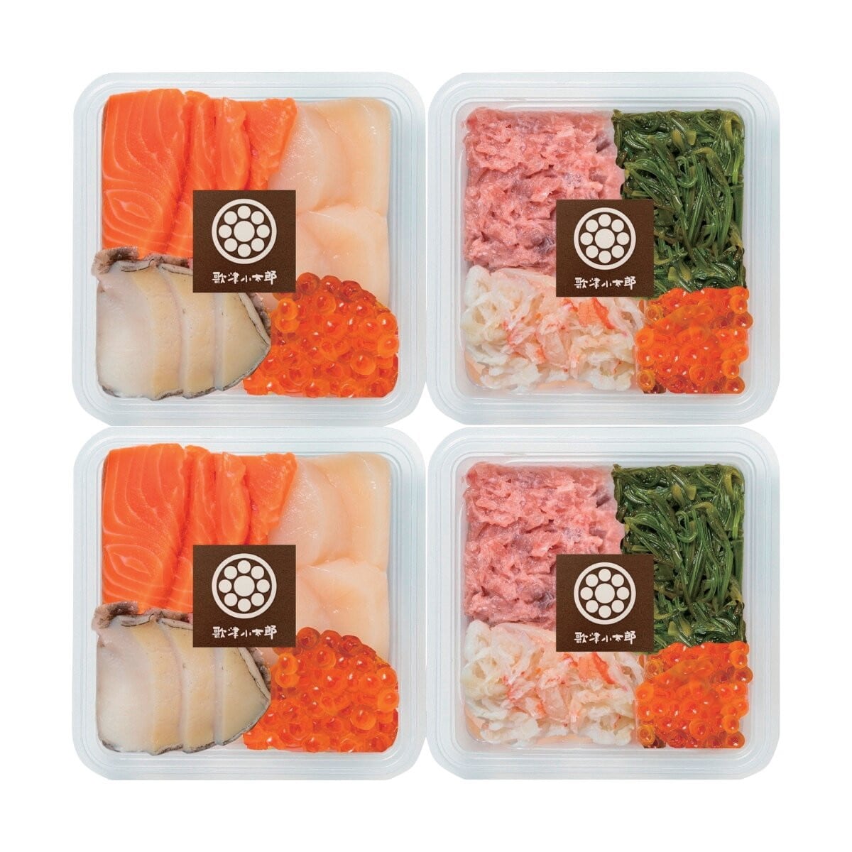 ●数量・内容:海鮮盛合せ(サーモン、ほたて、いくら、あわび)・海鮮丼の具(めかぶ、鮪たたき、カニ、いくら)各80g×2