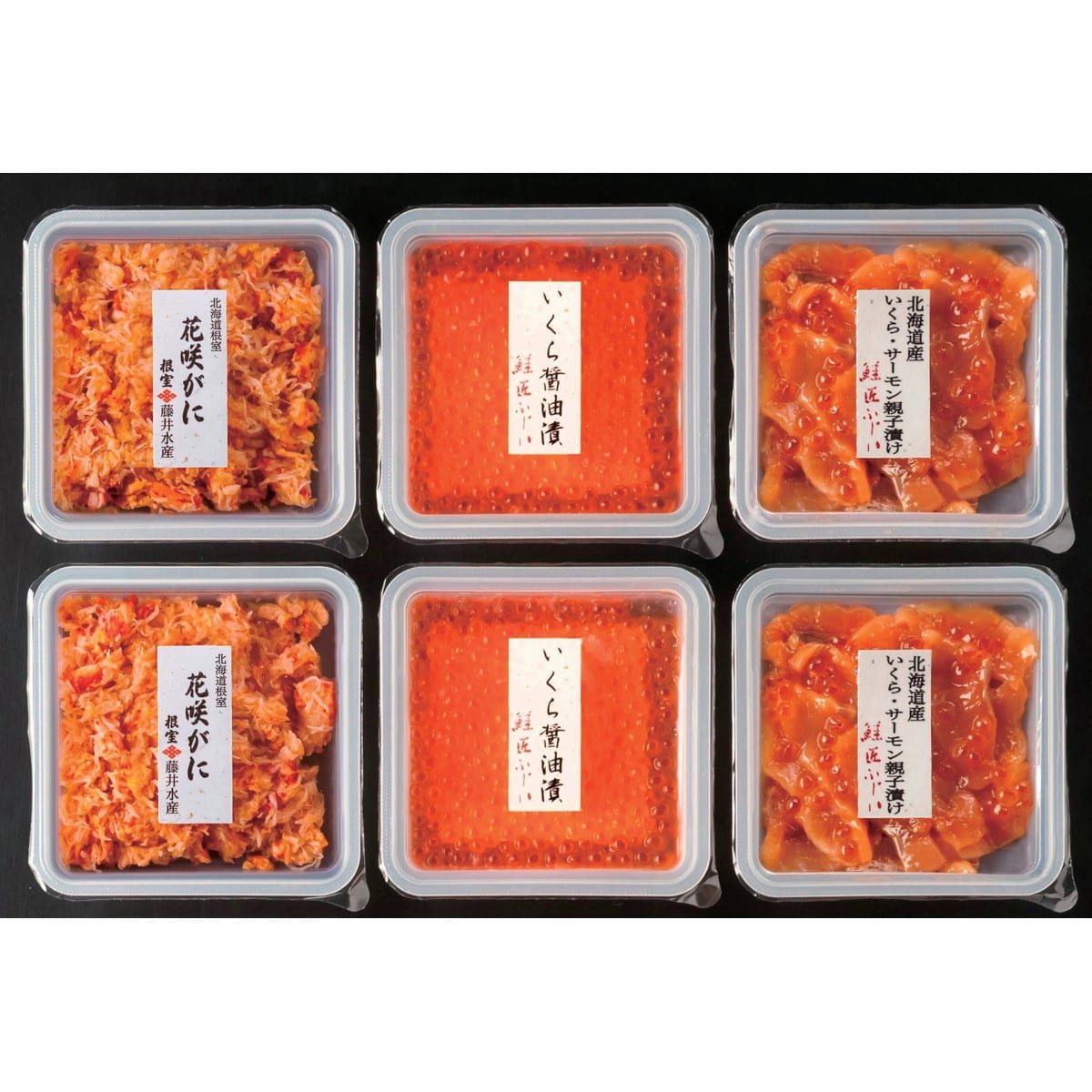 「北海道産 海鮮セット」 北海道近海で獲れる新鮮な秋鮭といくらを使用。いくらは、甘口仕立ての醤油で漬けました。濃厚な味わいの根室名産の花咲がには塩ゆでしたものを食べやすくむき身にしました。