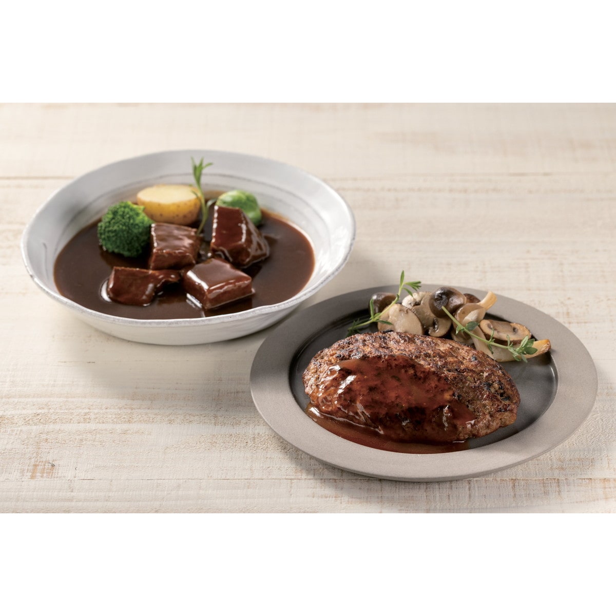 「レストラン鎌倉山ハンバーグ・ビーフシチューセット」 良質な国産牛肉と豚肉を使用し赤ワインと生クリームを隠し味に加えまろやかな味わいに仕上げたハンバーグと牛肉の旨みの溶けだしたビーフシチューセットです。