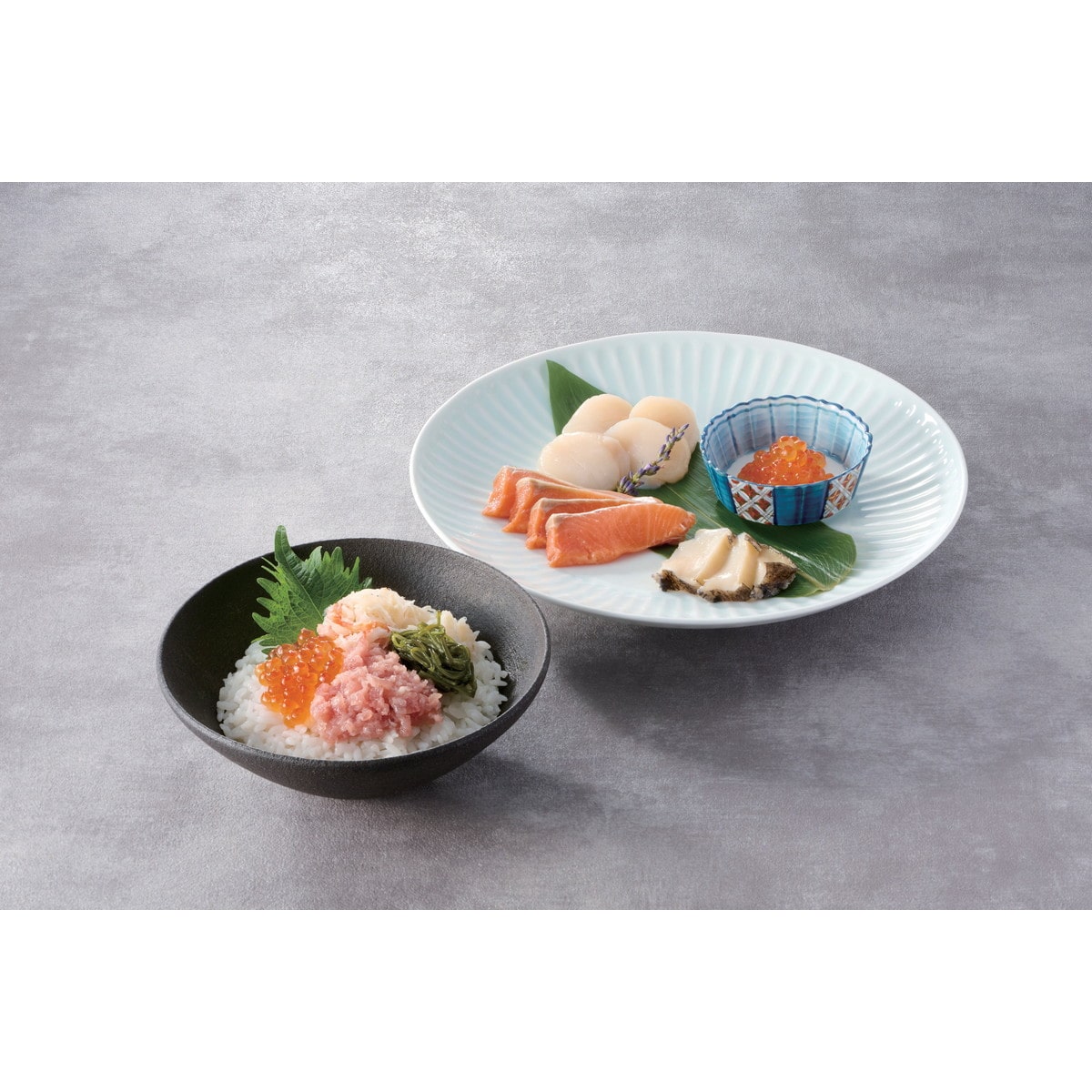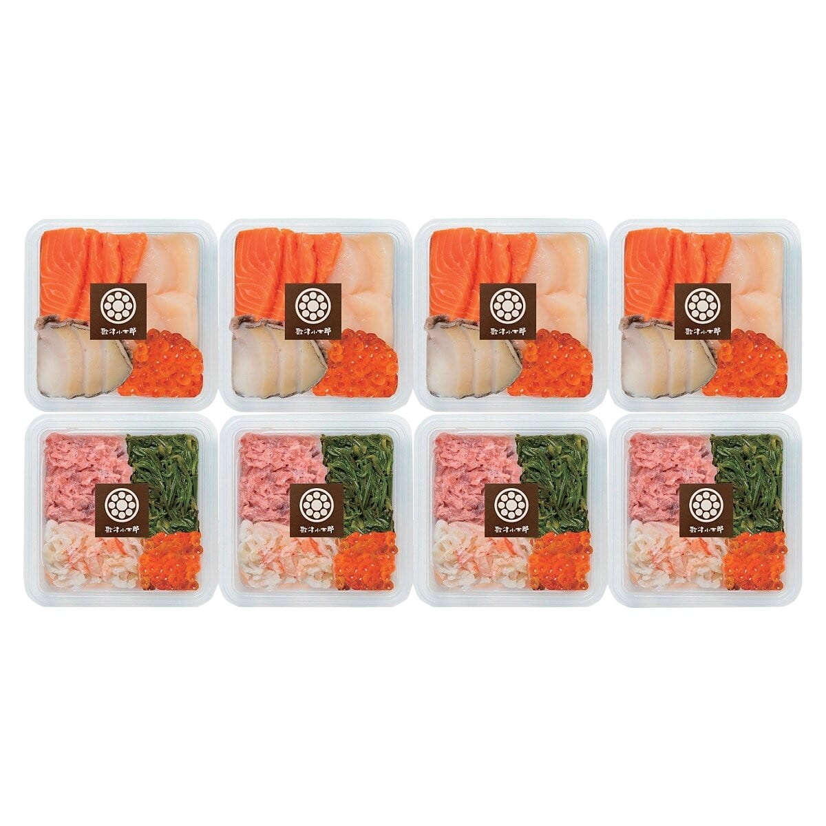 ●数量・内容:海鮮盛合せ(サーモン、ほたて、いくら、あわび)・海鮮丼の具(めかぶ、鮪たたき、カニ、いくら) 各80g×4