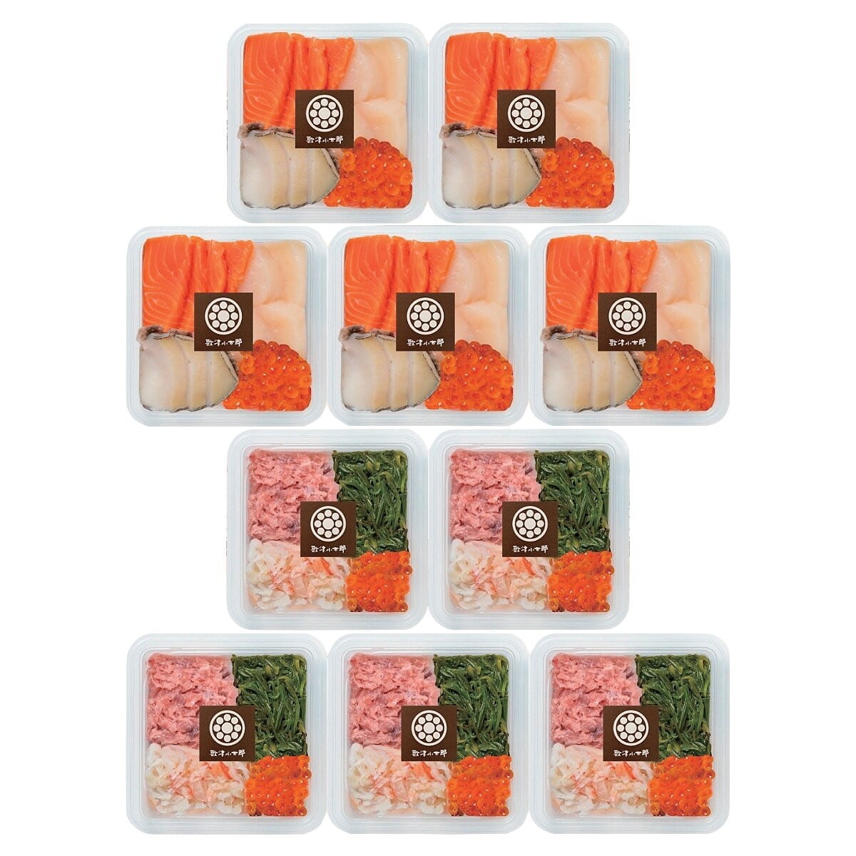 ●数量・内容:海鮮盛合せ(サーモン、ほたて、いくら、あわび)・海鮮丼の具(めかぶ、鮪たたき、カニ、いくら) 各80g×5