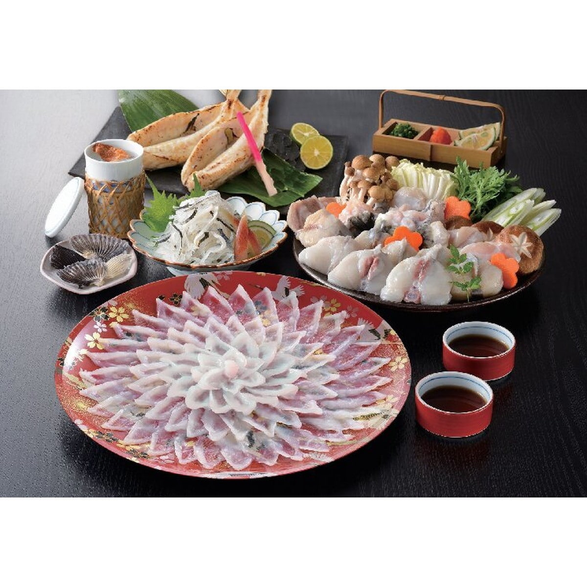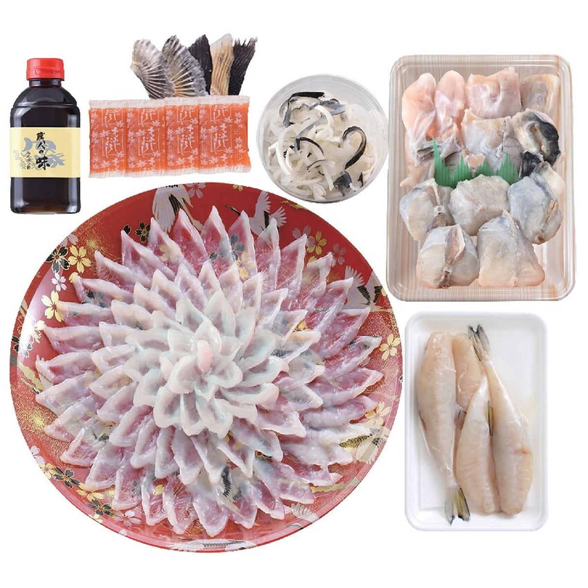 ●数量・内容:とらふぐ刺身(30cm皿)155g、とらふぐ皮60g、とらふぐちり(切身、アラ)300g、ふぐ一夜干し150g、ふくポン酢180ml、もみじおろし10g×4、とらふぐヒレ5枚