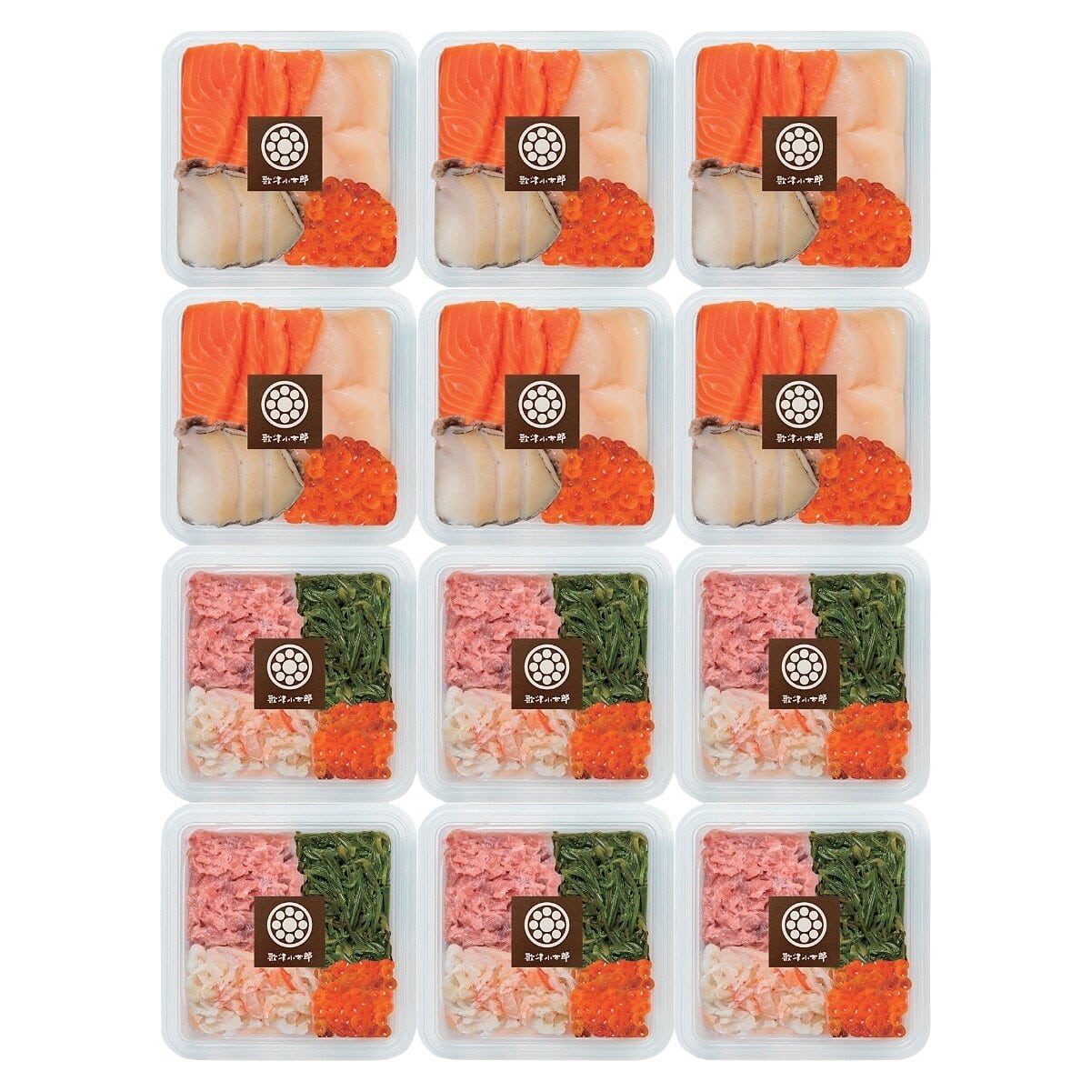 ●数量・内容:海鮮盛合せ(サーモン、ほたて、いくら、あわび)・海鮮丼の具(めかぶ、鮪たたき、カニ、いくら) 各80g×6