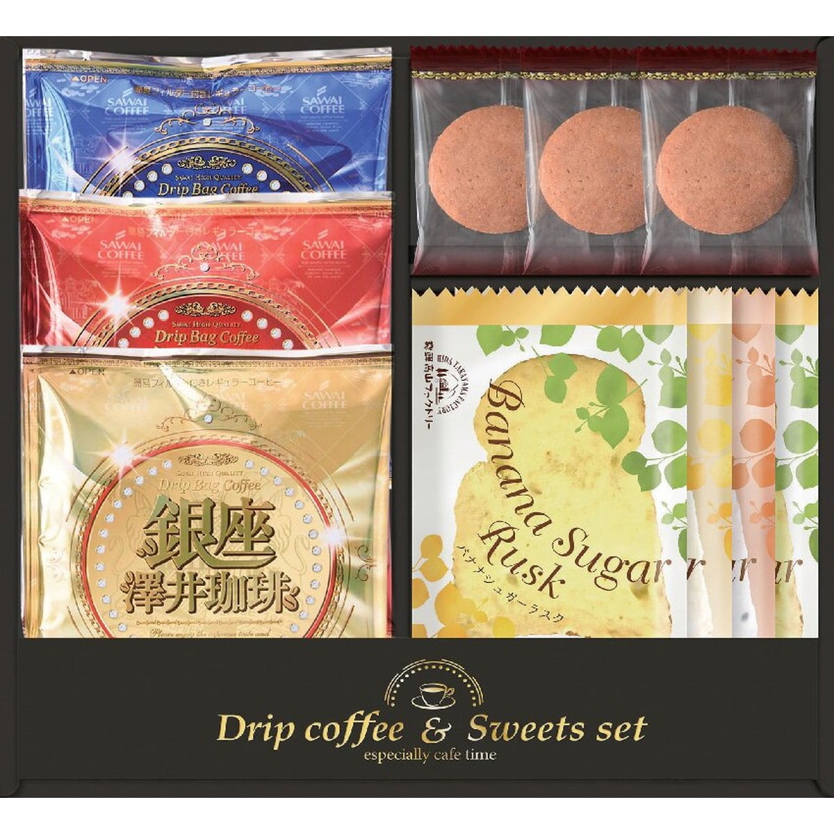 ●数量・内容:銀座澤井珈琲ドリップコーヒー(ゴールドブレンド・ルビーブレンド・ブレンドアクア)×各1、クリームモンブランクッキー×3、バナナラスク×2、シュガーラスク・セサミラスク×各1