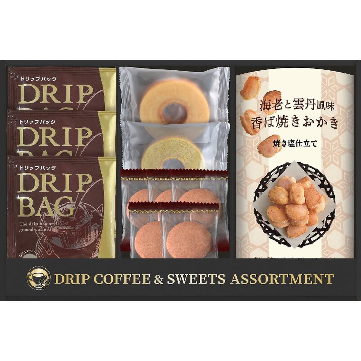 ●数量・内容:セイコー珈琲ドリップコーヒー×3、クリームモンブランクッキー×5、ミニバウムクーヘン(北海道生クリーム・宇治抹茶)×各1、海老と雲丹風味香ば焼きおかき40g